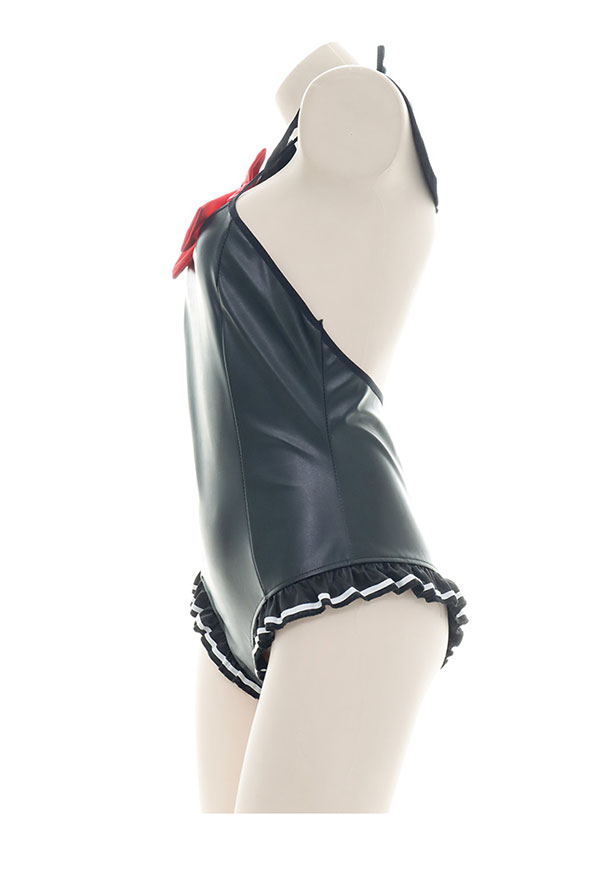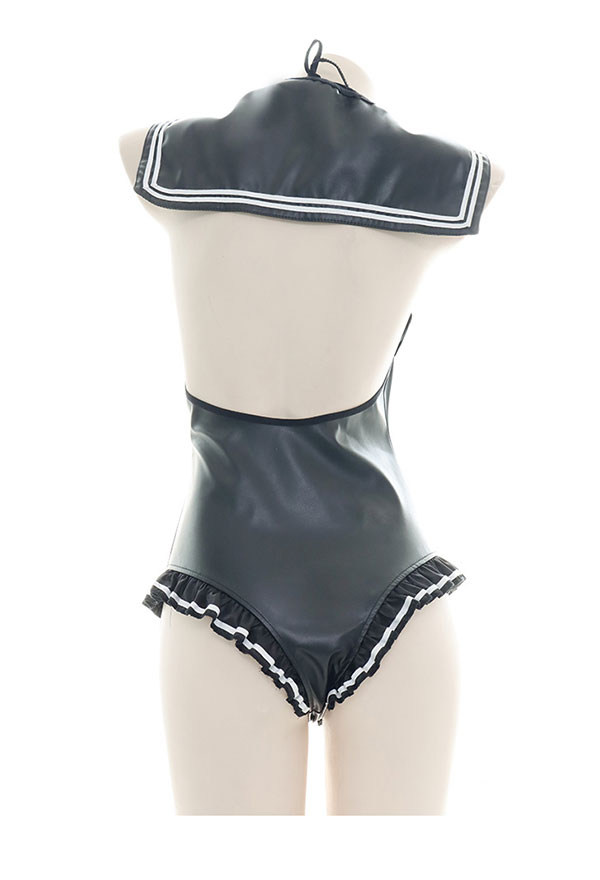 Faux Leather Bodysuit Backless Chest Open One Piece Swimwear Japanese Style Sailor Collar Bowknot Ruffled Swimsuit Halter Neck Sexy Lingerie Homewear Sleepwear Bathing Suit