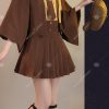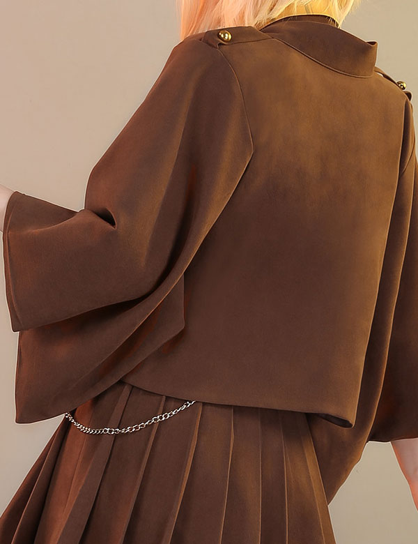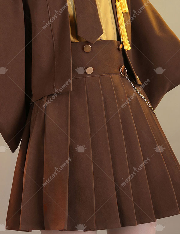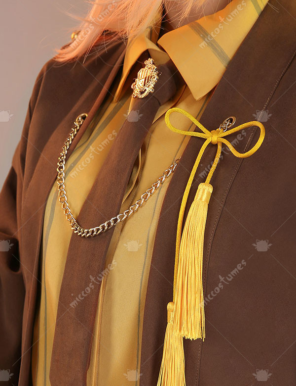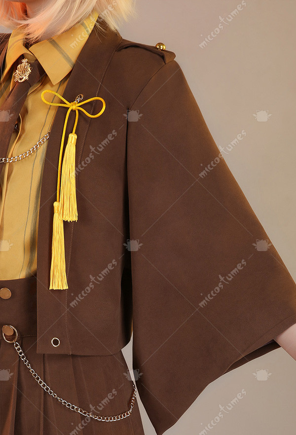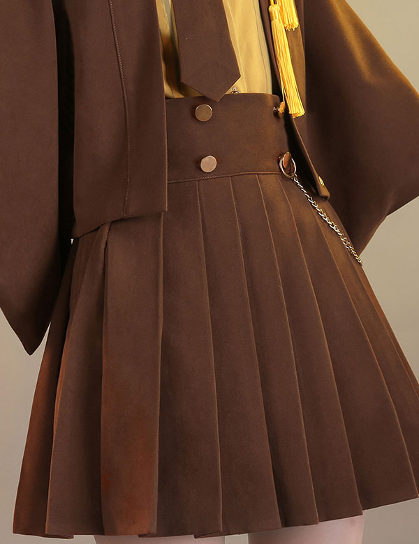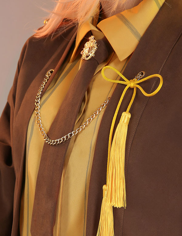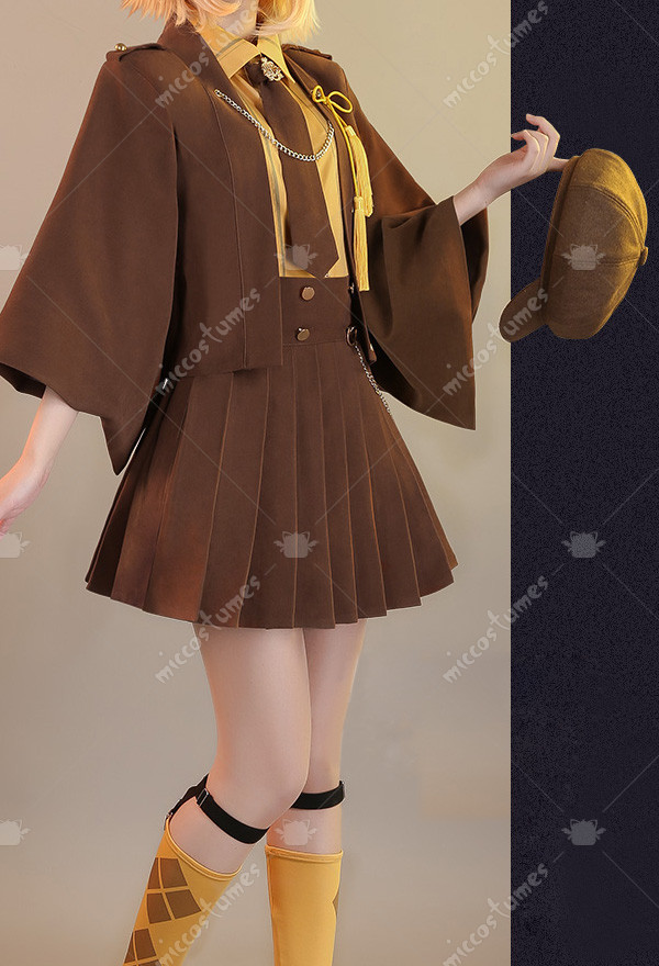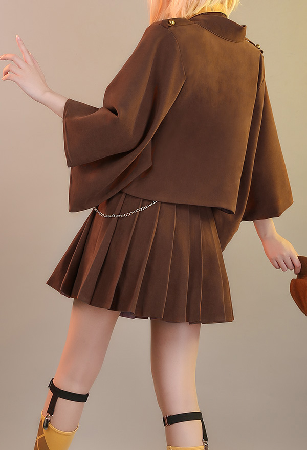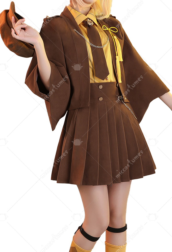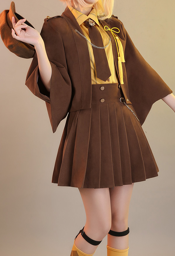 The costume includes coat, skirt, shirt, hat, socks, tie, chain, badge, chest accessory*1, garters*2. It is made of twill fabric, suede fabric.