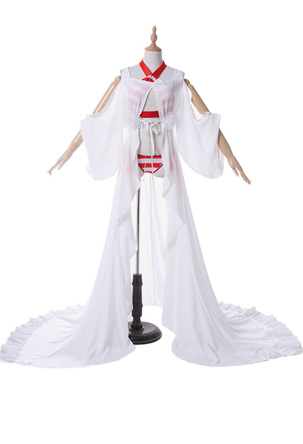 The main material is chiffon and spandex. The costume includes bikini top, bikini panties, waistband, and the chiffon blouse.