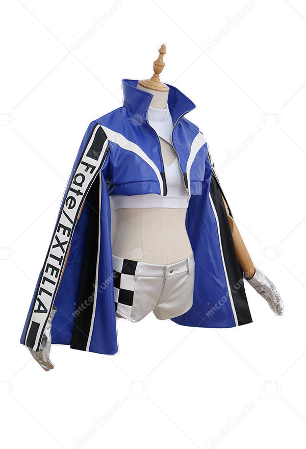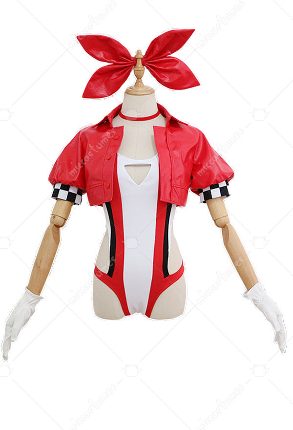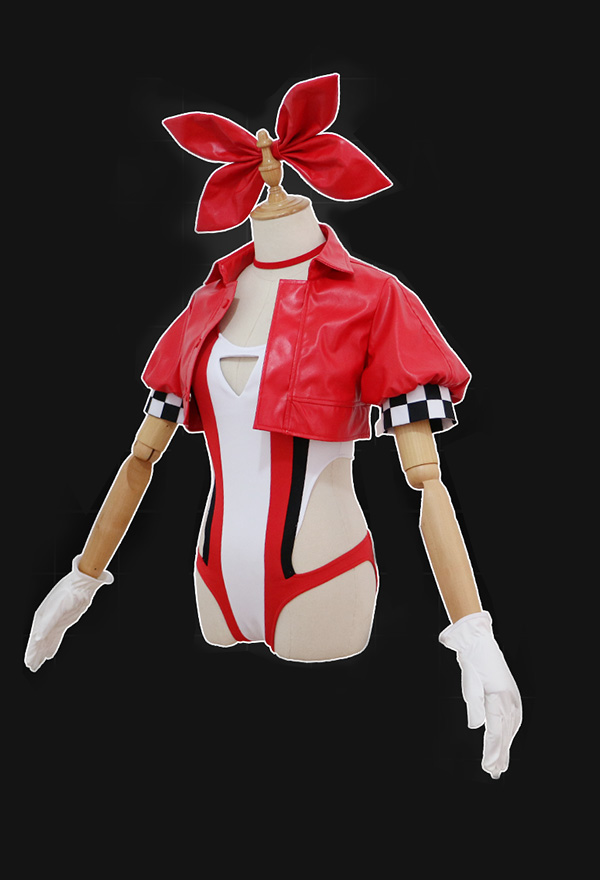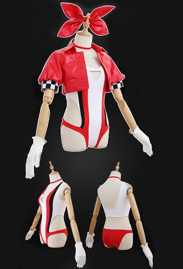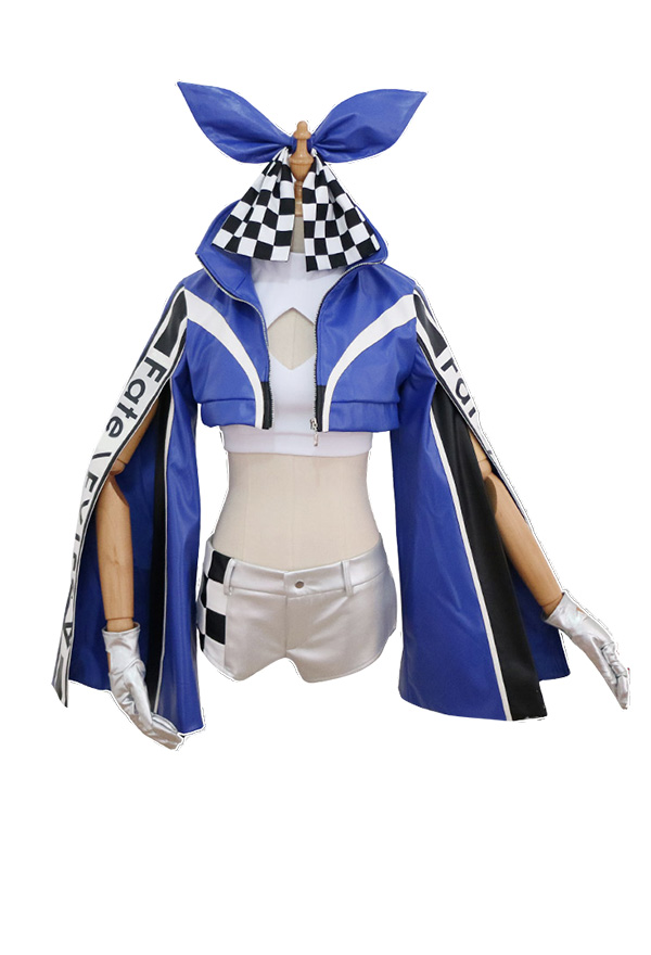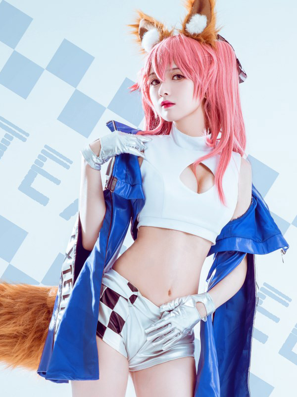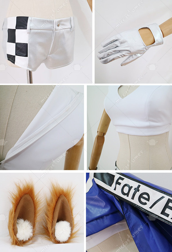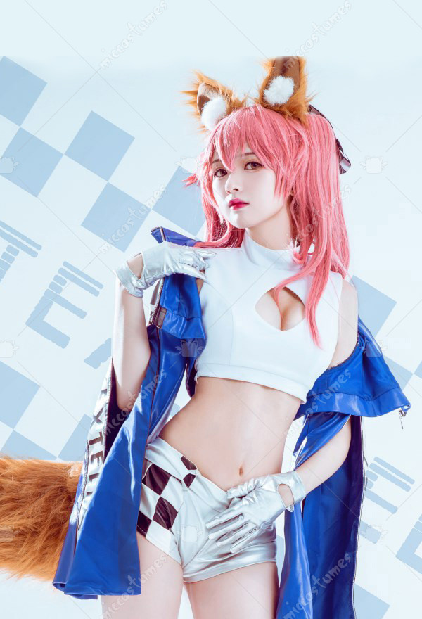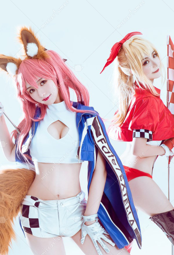 The Nero costume includes jacket, bodysuit, choker, hair bow, gloves, leg accessory, racing flags. The Tamamo no Mae costume includes jacket, shorts, white vest, ear accessories, headdress, gloves, racing flags. They are made of quality PU leather and spandex.