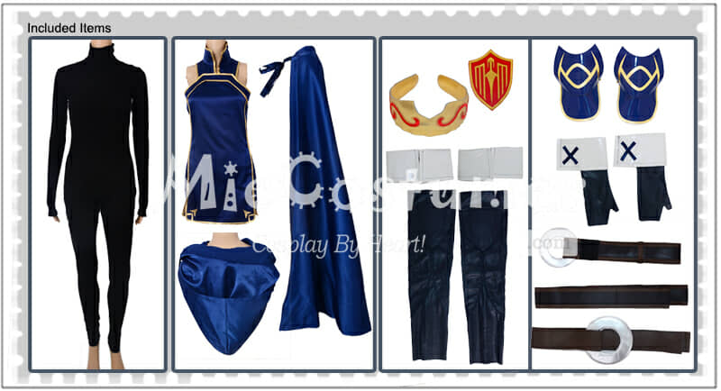 | Included Items | Black zentai, blue vest, neckerchief, shoulder pads, headdress, cloak, belts, gloves, leg guards |