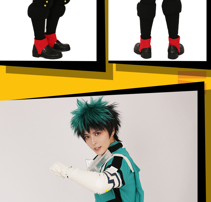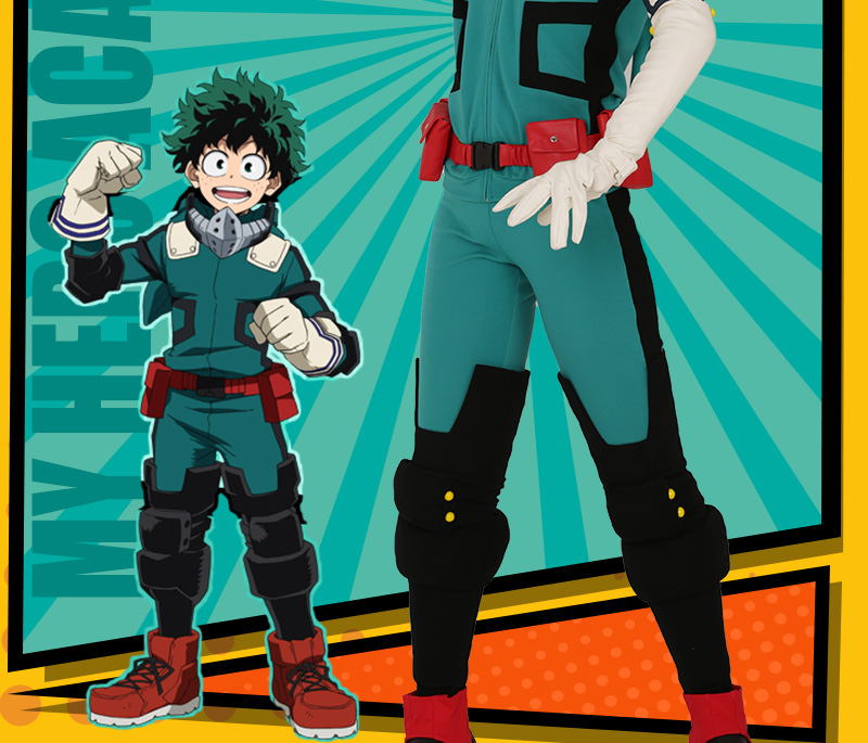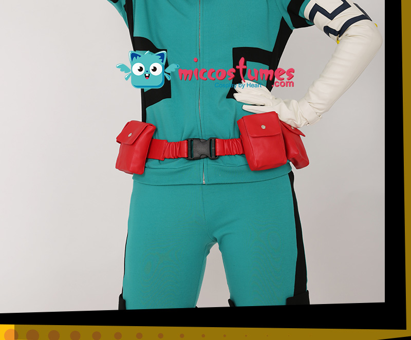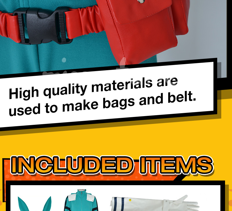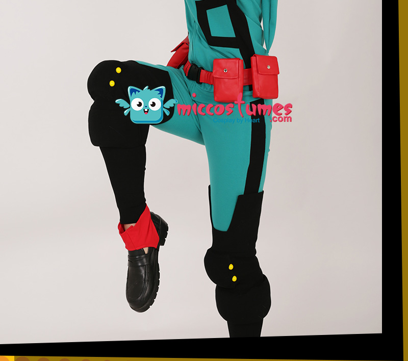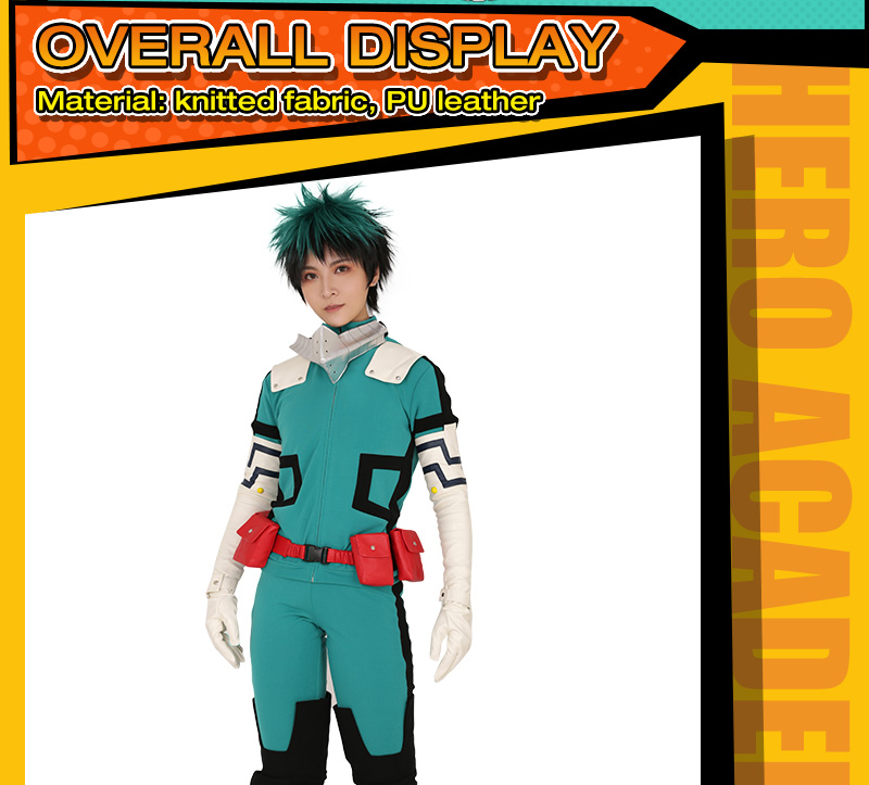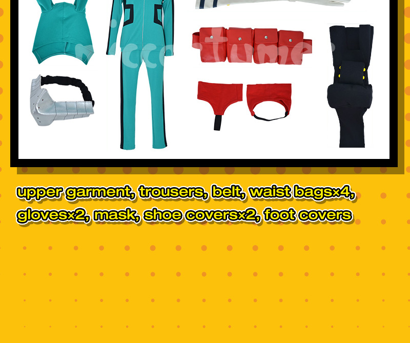 Includes: upper garment, trousers, belt, waist bags×4, gloves×2, mask, shoe covers×2, foot covers Materials: knitted fabric, PU leather. Nice Details: This Izuku's second hero costume made of sturdy knitted fabric for lasting long. Deku cosplay knee pads are long enough to cover your legs. Midoriya cosplay respirator covers the nose and mouth with 8 holes.