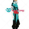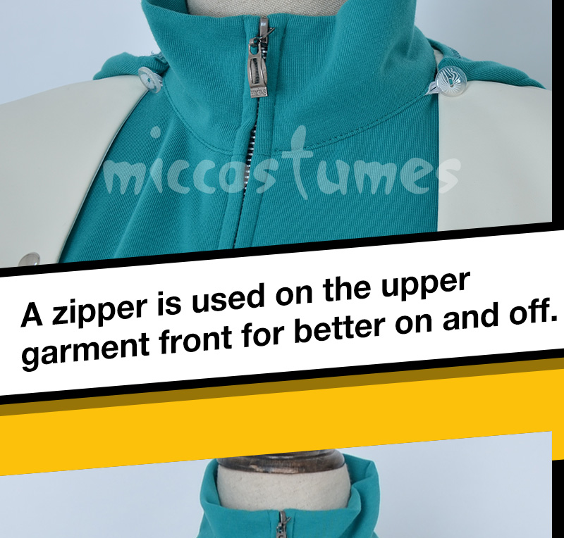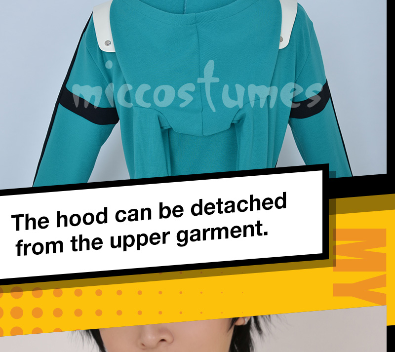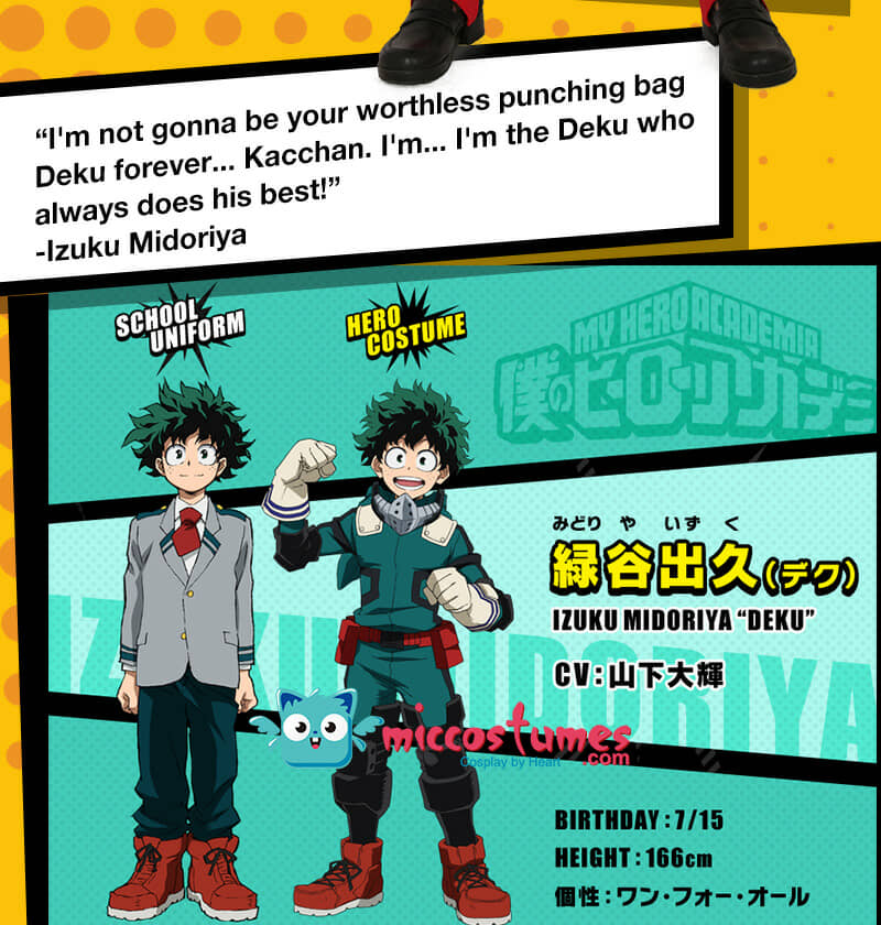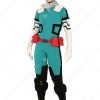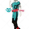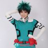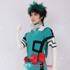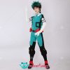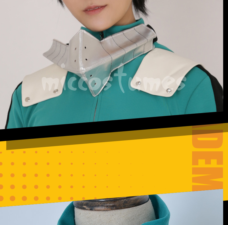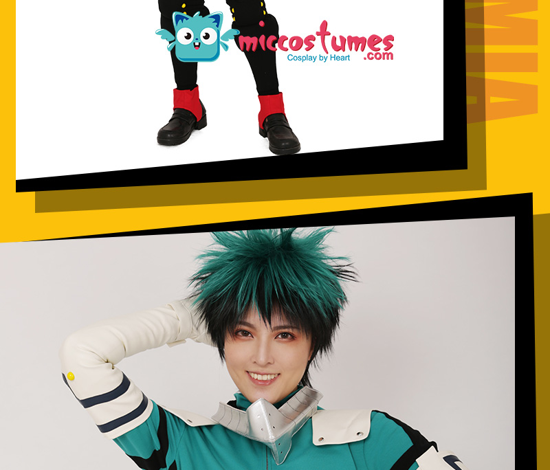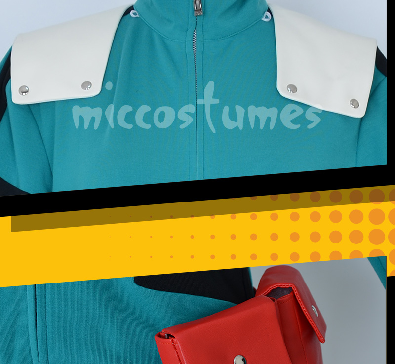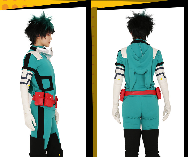 Includes: upper garment, trousers, belt, waist bags×4, gloves×2, mask, shoe covers×2, foot covers Materials: knitted fabric, PU leather. Nice Details: This Izuku's second hero costume made of sturdy knitted fabric for lasting long. Deku cosplay knee pads are long enough to cover your legs. Midoriya cosplay respirator covers the nose and mouth with 8 holes.