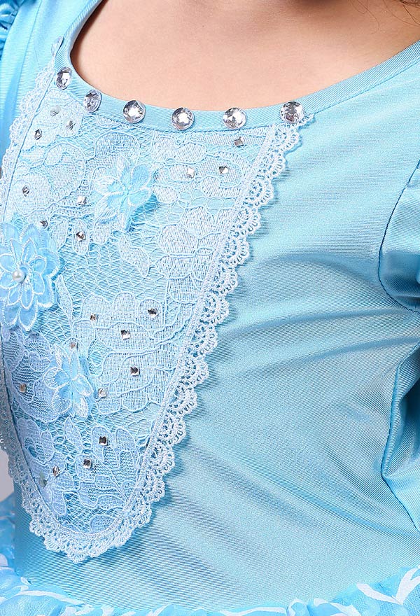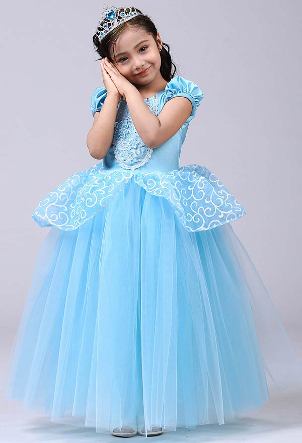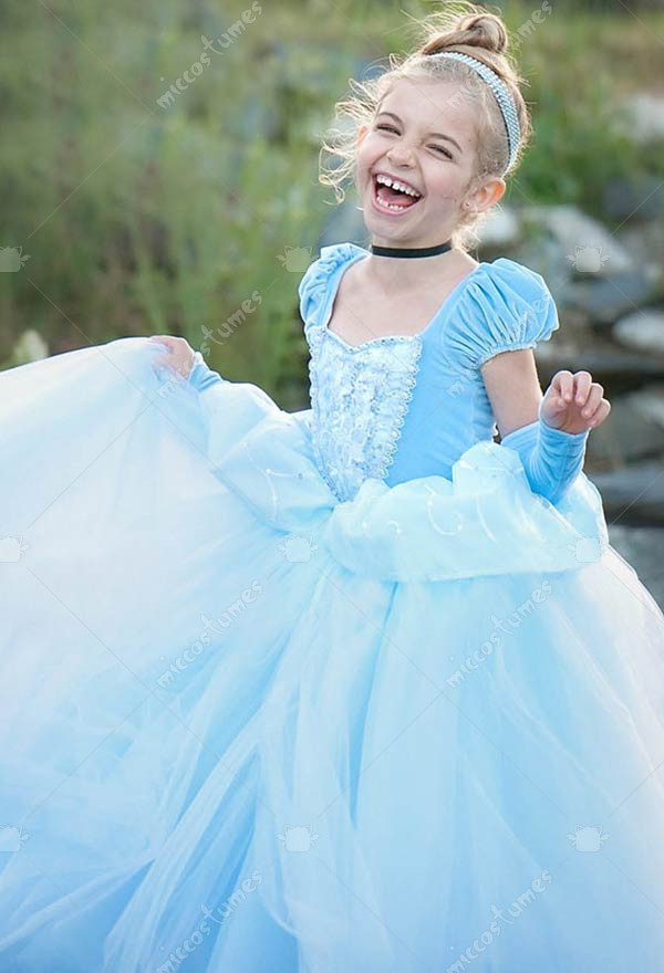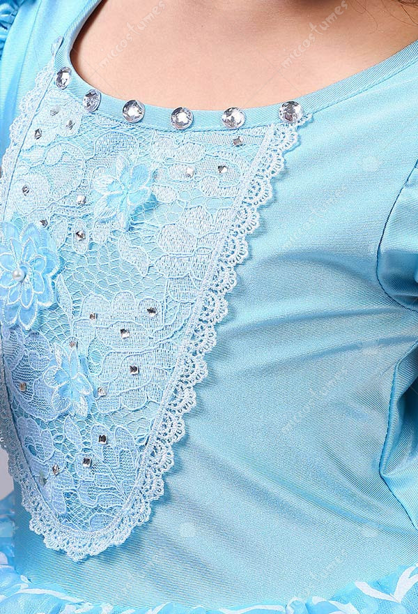 The costume includes oversleeves. It is made of polyester, cotton and gauze.