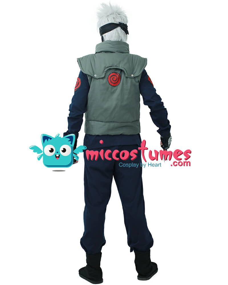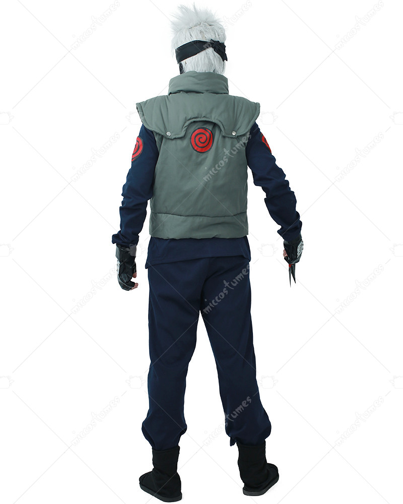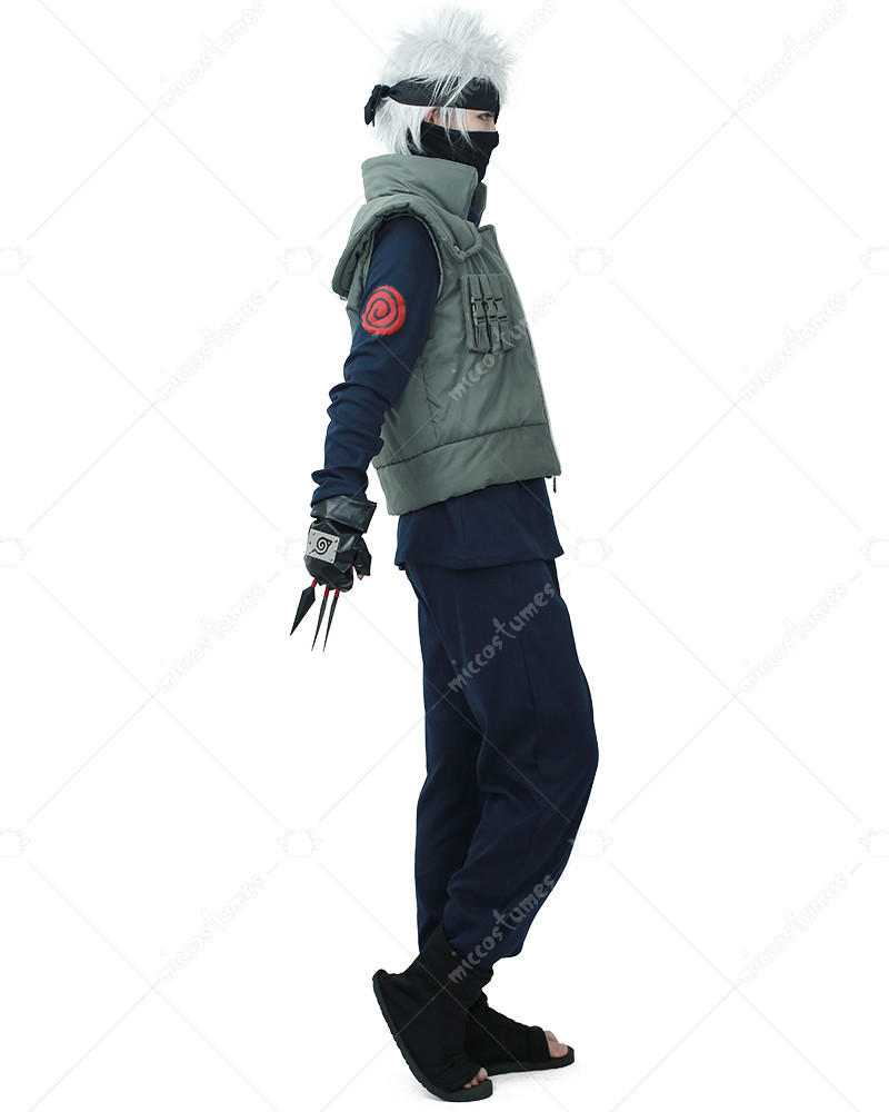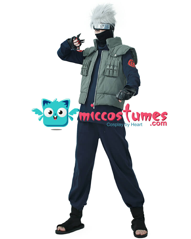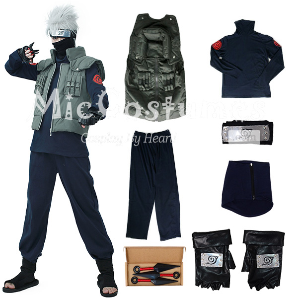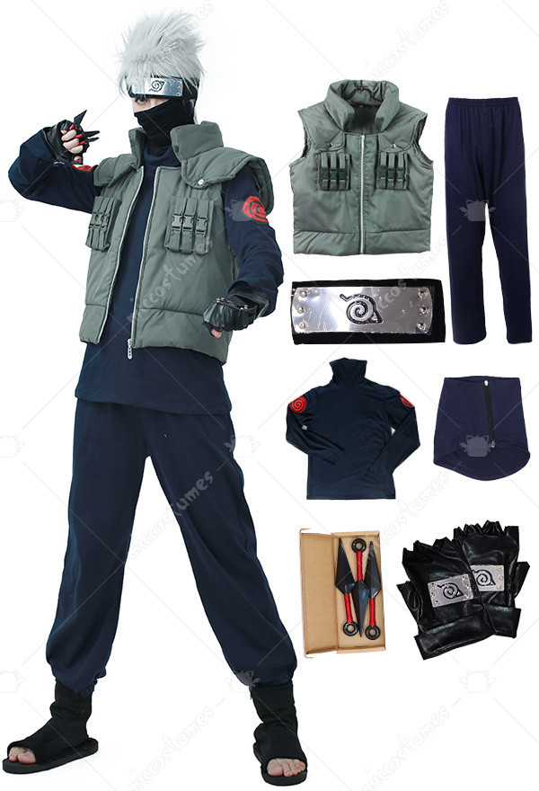 Includes: Inner shirt, pants, vest, headband, mask, gloves and a set of Ninja Kunai Throwing Knives Materials: Cotton Details: The Kakashi outfit is made of quality material that's comfortable and breathable to wear. The Kakashi vest made of cotton is sturdy enough to last for years. The black turtleneck shirt is printed with Kakashi logo on each shoulder.