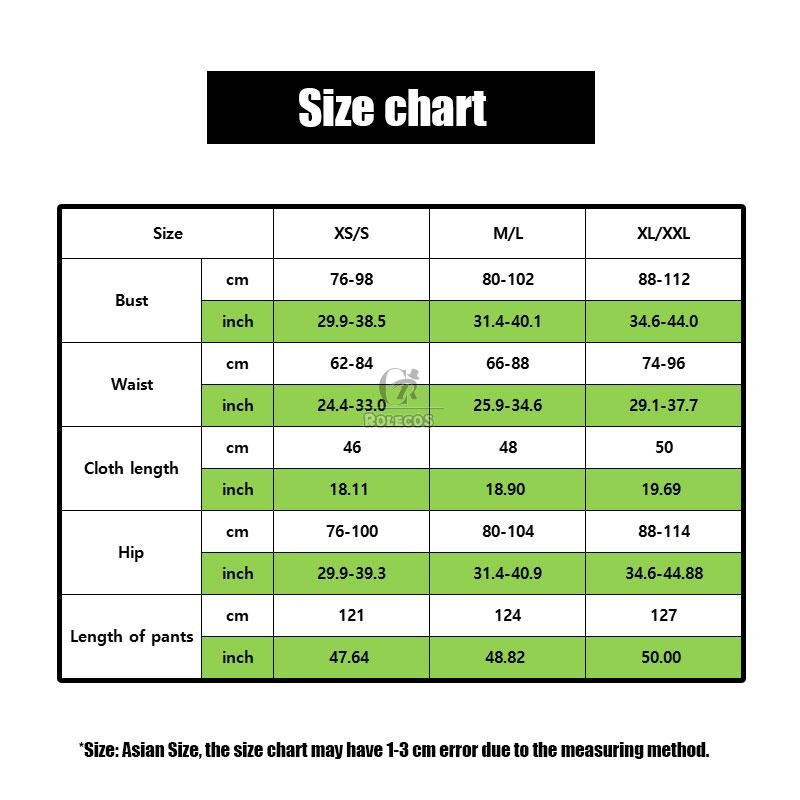 Included Items:Bodysuit, skirt, sleeve cover, waist accessory, back bow tie, head accessory, pantyhose, back waist accessory, neck bell, gloves, back strap*1