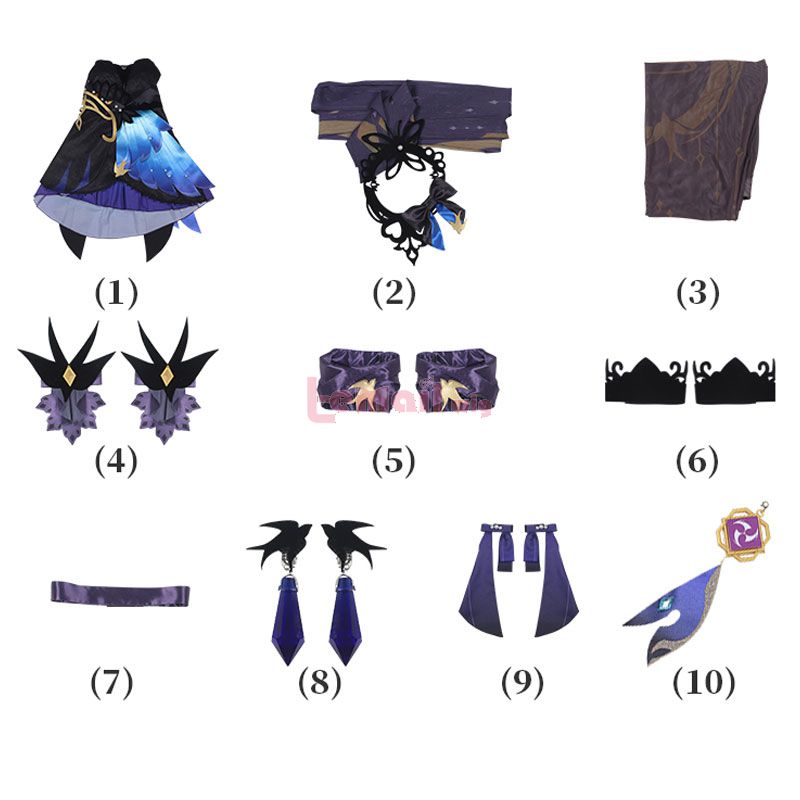 Included: Dress, necklaces, printed tights, wristbands, cuffs, cuff ornaments, wristbands, earrings, headbands, glowing eyes of the gods
