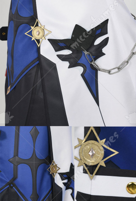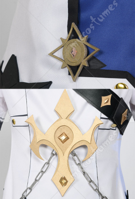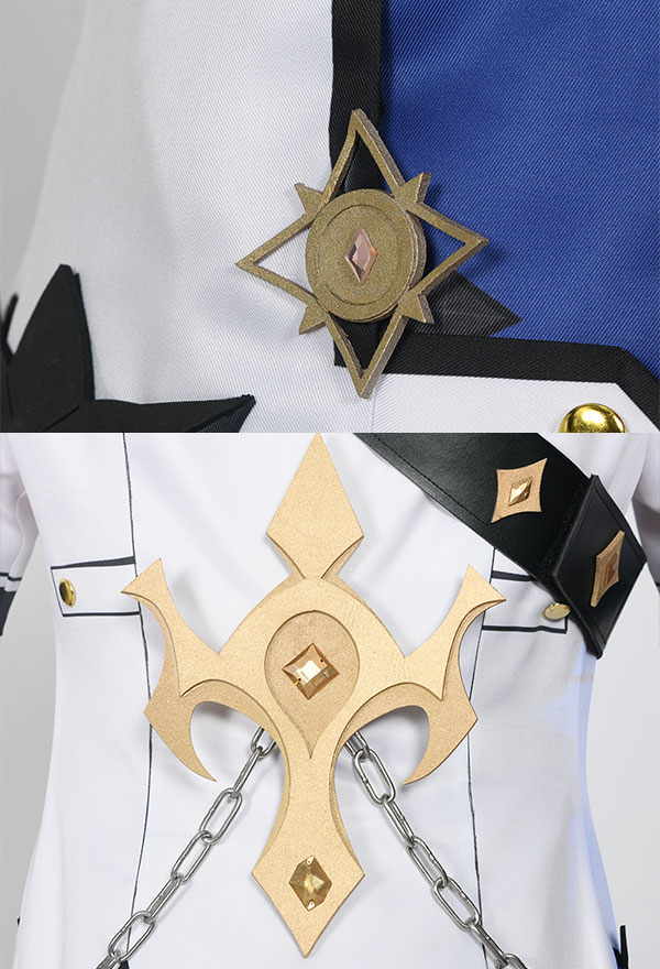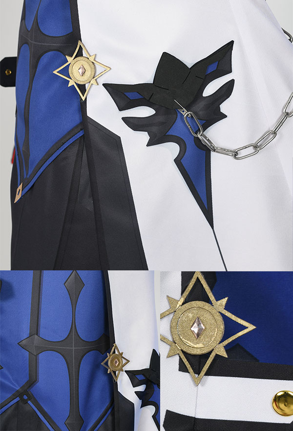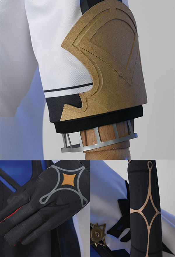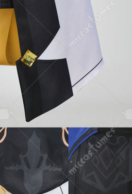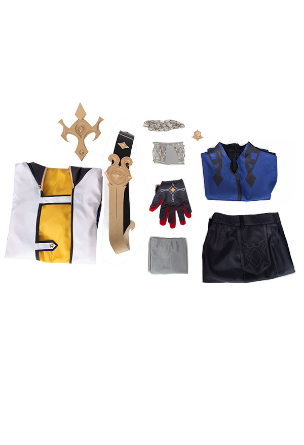 Costume Includes: jacket, inner coat, collar decoration, gloves*2, shorts, back decoration, chain decoration, belt, arm rings*2, leg covers*2. Material: soft fabric, milk silk, spandex, lining cloth, composite leather EVA, print, silver leather.