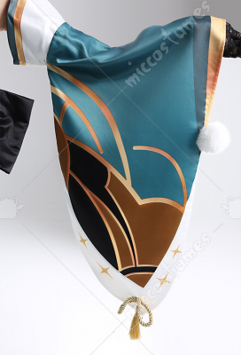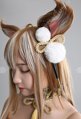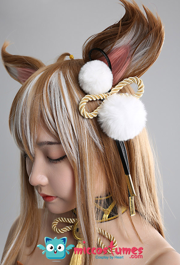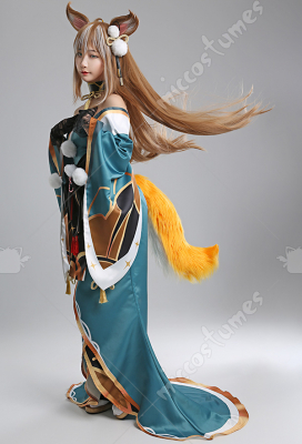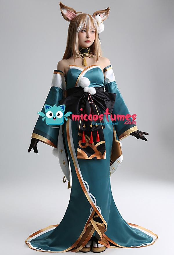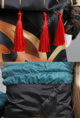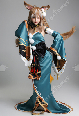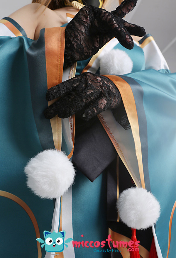 Design Details: This costume is designed in a digital organza print. And this is a strapless mermaid dress. The obi adopts Velcro to adjust the size. Sleeves, neck ornaments, bows and headdress are all hand-stitched with golden rope and tassels, and the fur balls are also hand-stitched. The costume also comes with gloves.