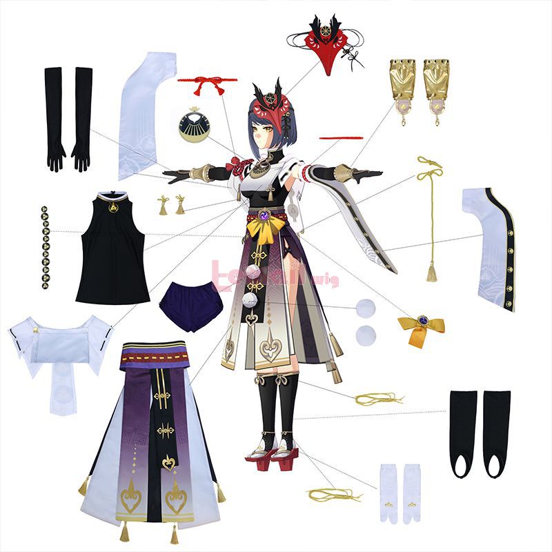 Included: Waist skirt, leggings, gloves, head armor accessories, arm sleeves*2, back lanyard tassels, leg sleeves, leg ropes, two-finger socks, accessories