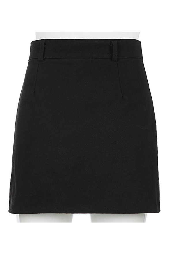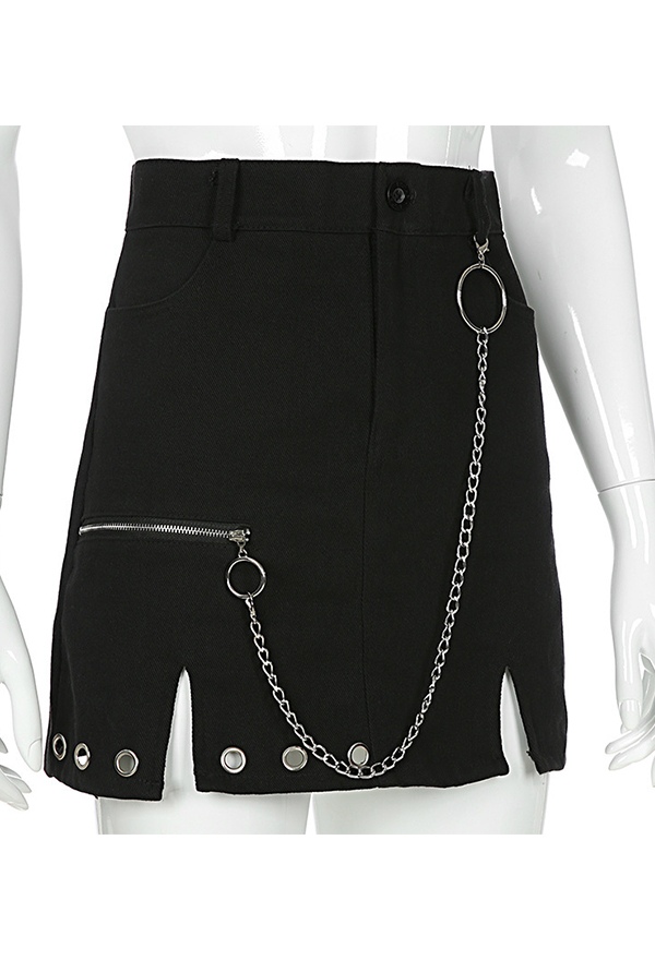 Gothic Punk Dark Style Women Hem Split Short Pencil Skirt High Waist Fitted Bodycon Skirt with Metal Chain Ornament