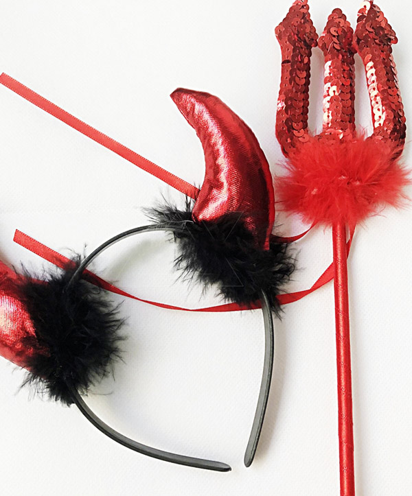 The costume includes dress, accessories(hair accessory and pitchfork). It is made of polyester.