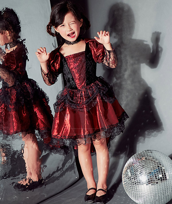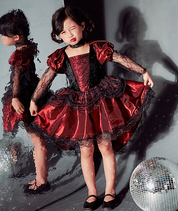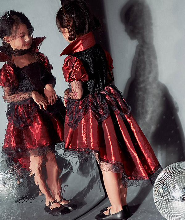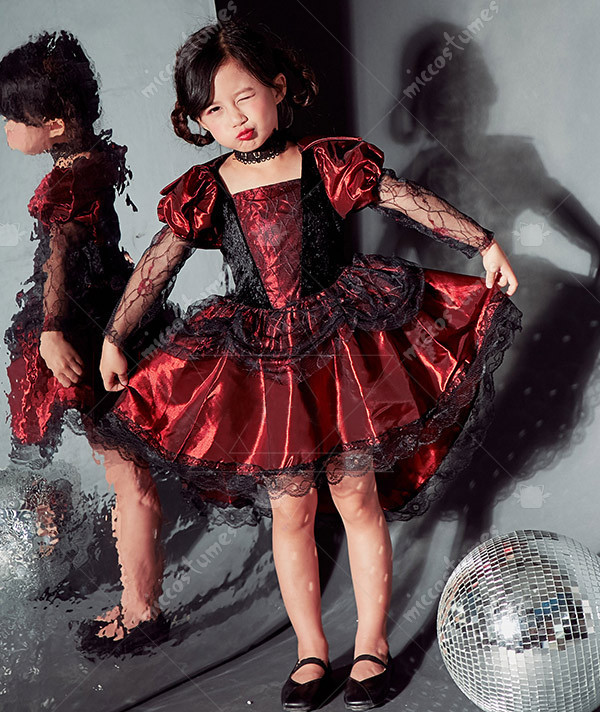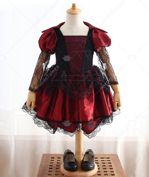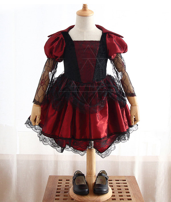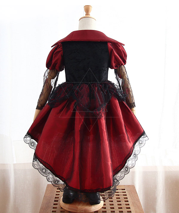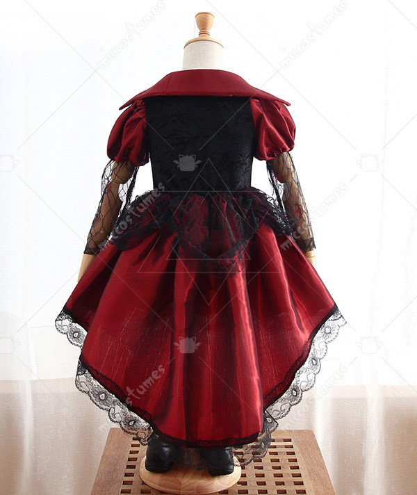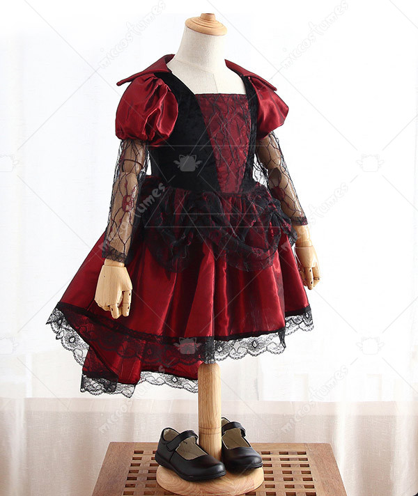 The costume includes dress, neck accessory. It is made of polyester, lace.