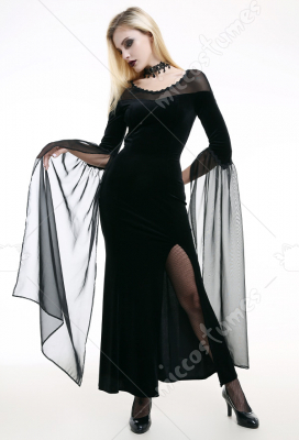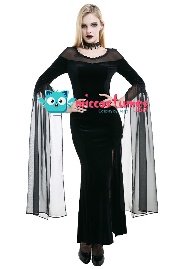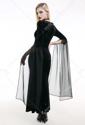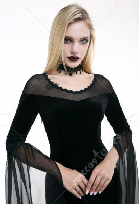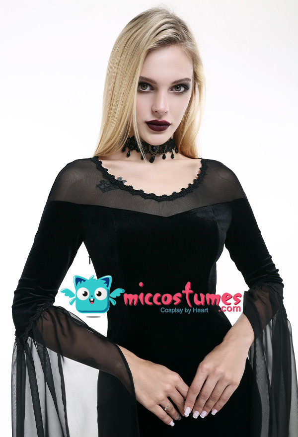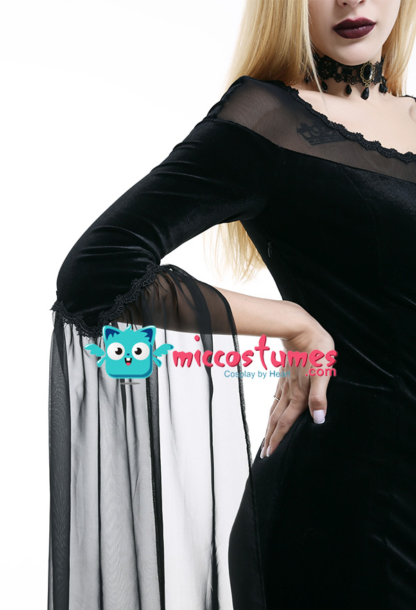 Costume Includes: dress. Material: velvet, lace. Design Details: The dress adopts velvet as the material, with slit design on the side, vintage and elegant. The collar is spliced with elastic net yarn, with the decoration of lace. The cuff is with light chiffon fabric.