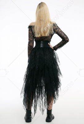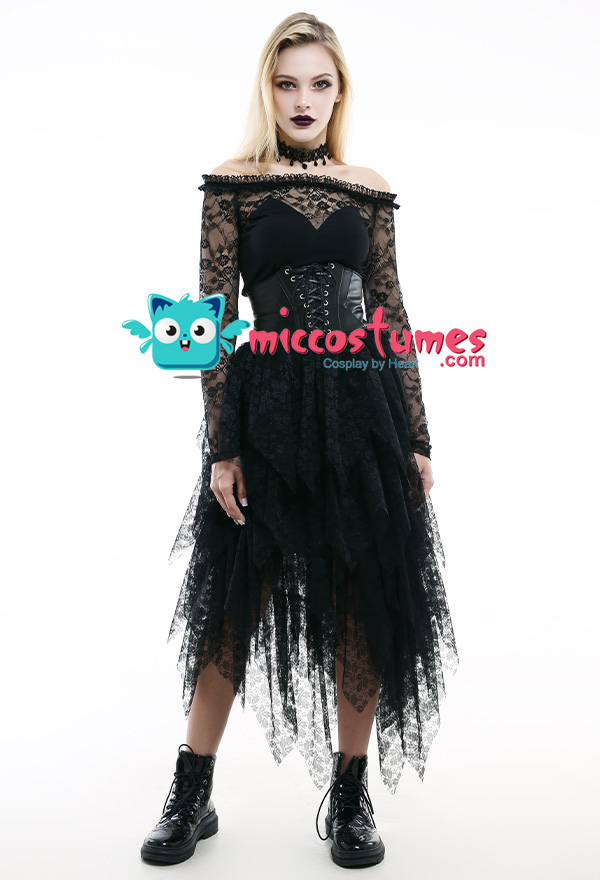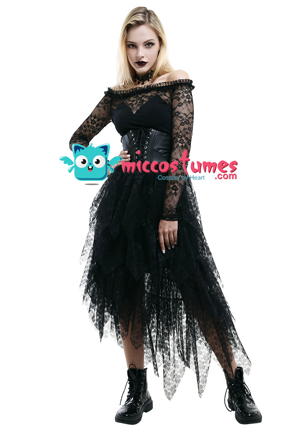 Halloween Dark Style Gothic Punk Women Cute Ruffled Off Shoulder Sheer Lace Sleeve Top Multi Layers Irregular Skirt Two Set Retro Goth Outfits