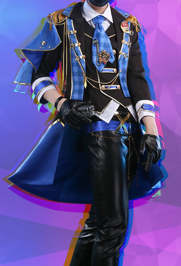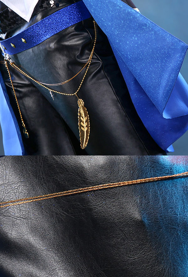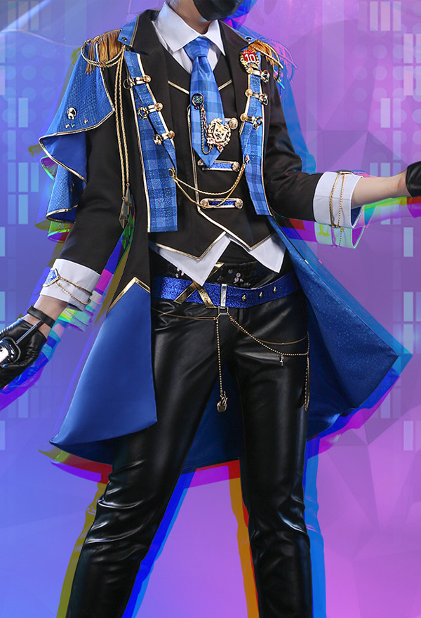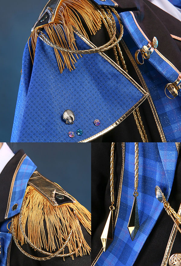 The costume includes coat, pants, shirt, vest, badge, pendant, wristband*1, glove*2, shoulder accessory*2, belt*2, tie, waist accessory, coat accessory chain, shoulder pendant. It is made of uniform cloth, faux leather.