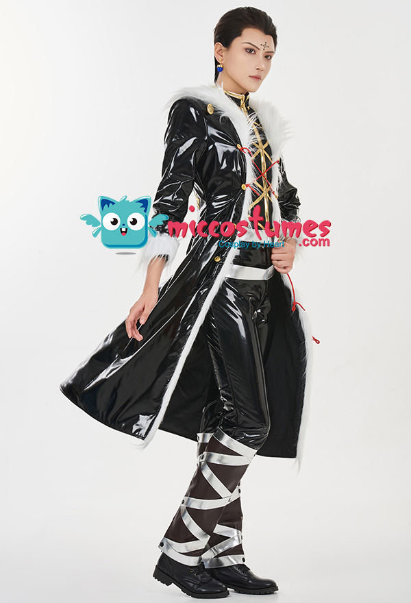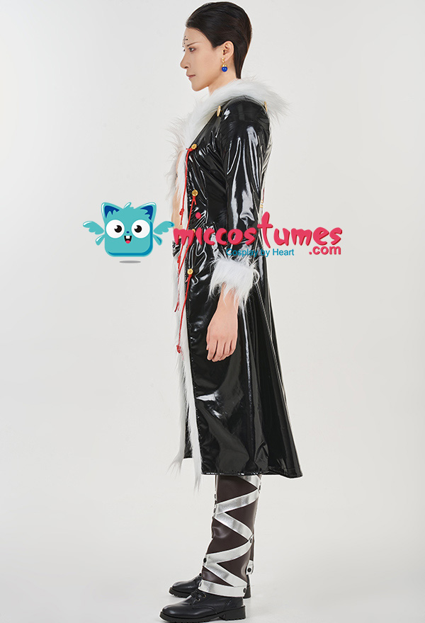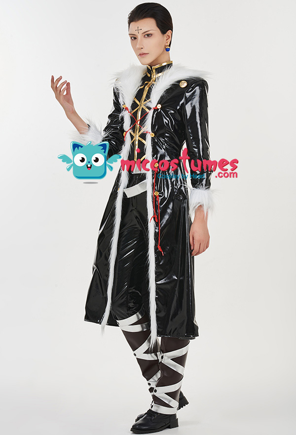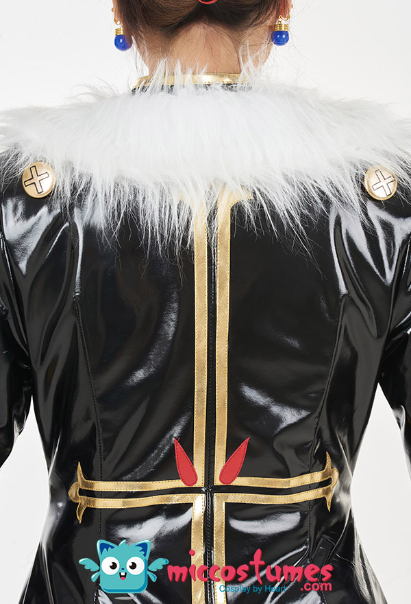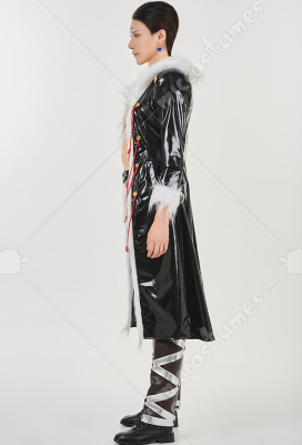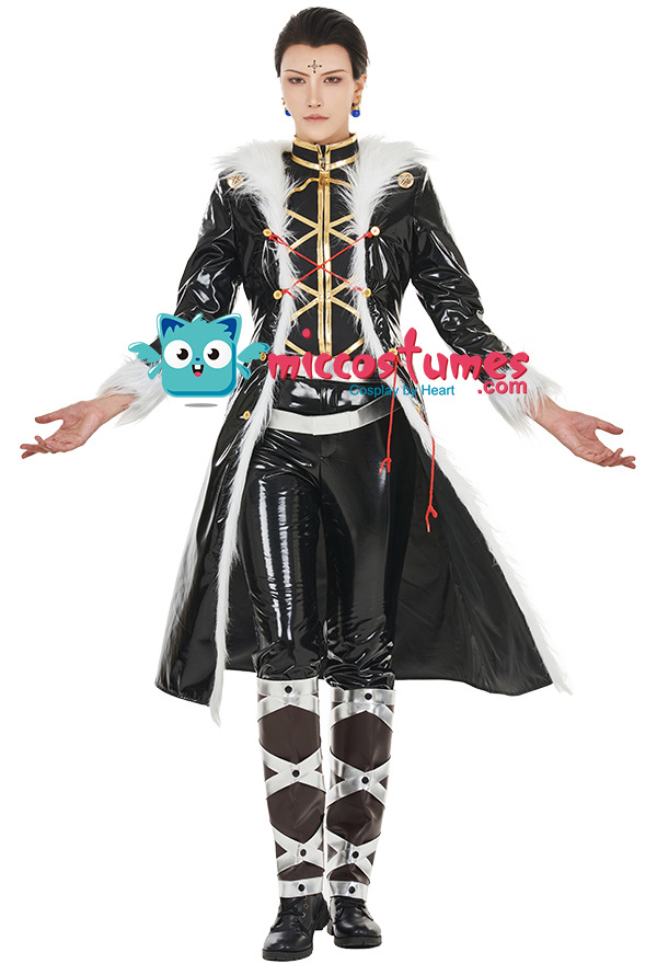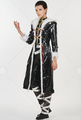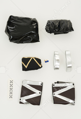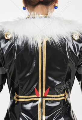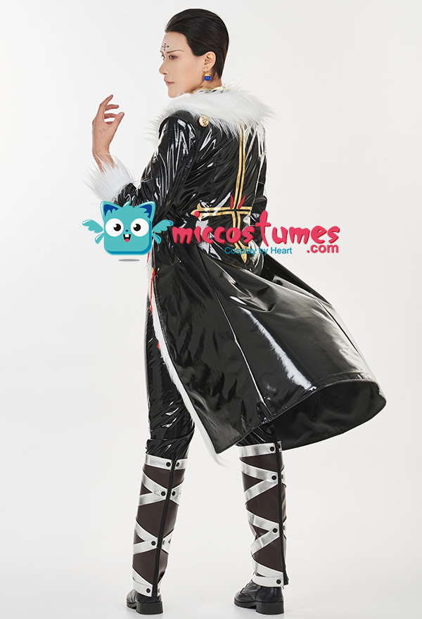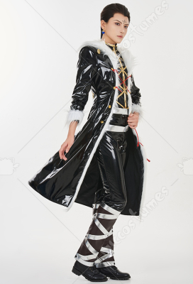 Design Details: The coat and trousers are mostly made of stretch bright leather, with furry collars on the coat, and gold leather trims on the back of the coat and the inner shirt. The belts are attached with Velcro, and the leg guards have hidden zippers and are decorated with plastic snap buttons.