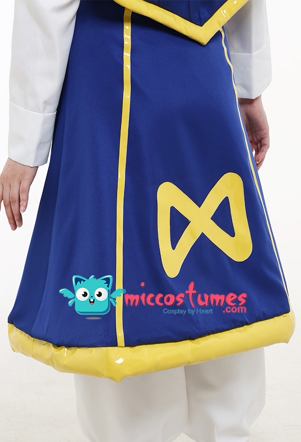Costume Includes: inner coat, pants, cloak, outer skirt. Material: polyester, pu leather, EVA. Design Details: Both the inner coat and pants are made of polyester. The outer skirt and cloak are both spliced with yellow PU leather. The hem is with a button underneath, which can be puffy enough. The waist part is with an adjustable buckle.