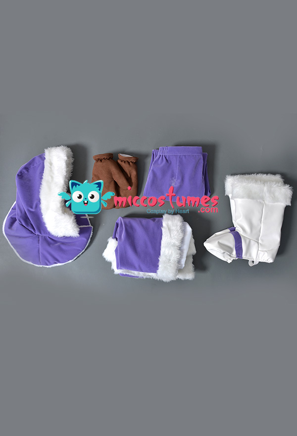 The costume includes hooded cape, coat, pants, shoes cover*2, glove*2. It is made of spandex, PU leather, suede fabric, fur imitation, faux lambswool fabric, velveteen.