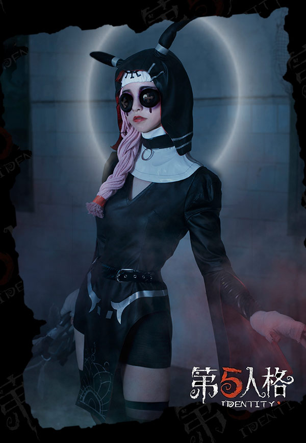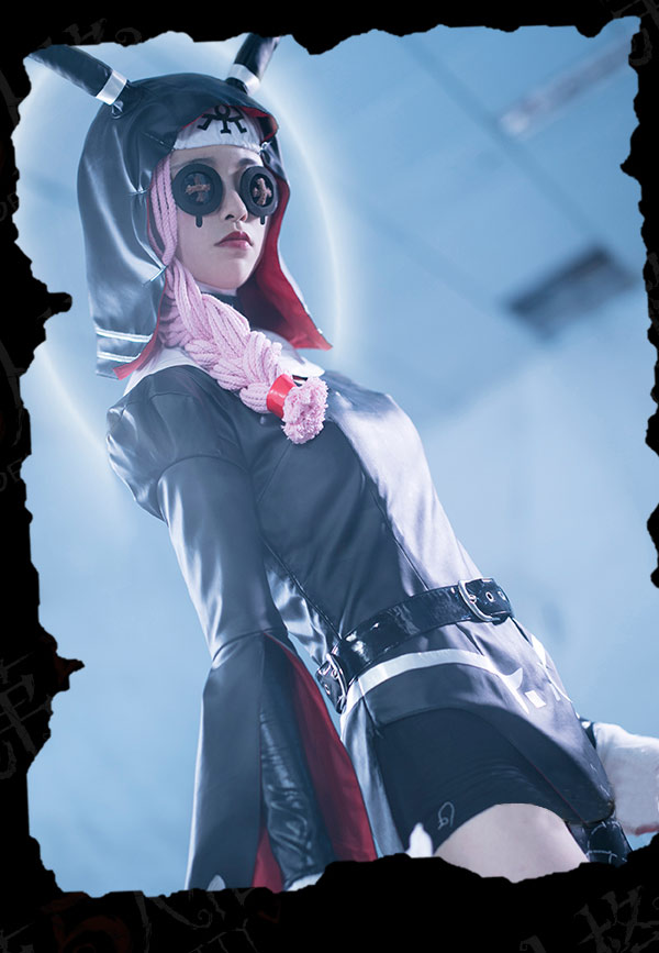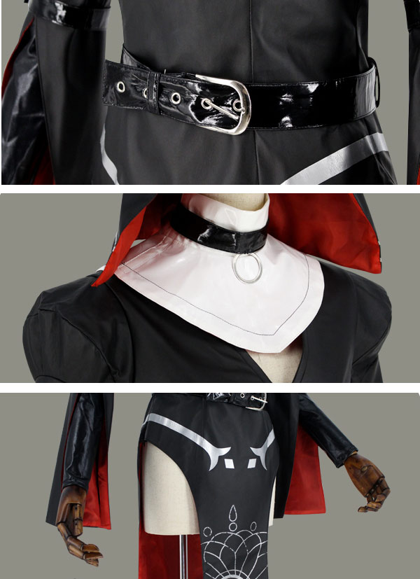 The costume includes top, collar, hat, headband, choker, arm accessory, belt, socks. It is made of pu leather.
