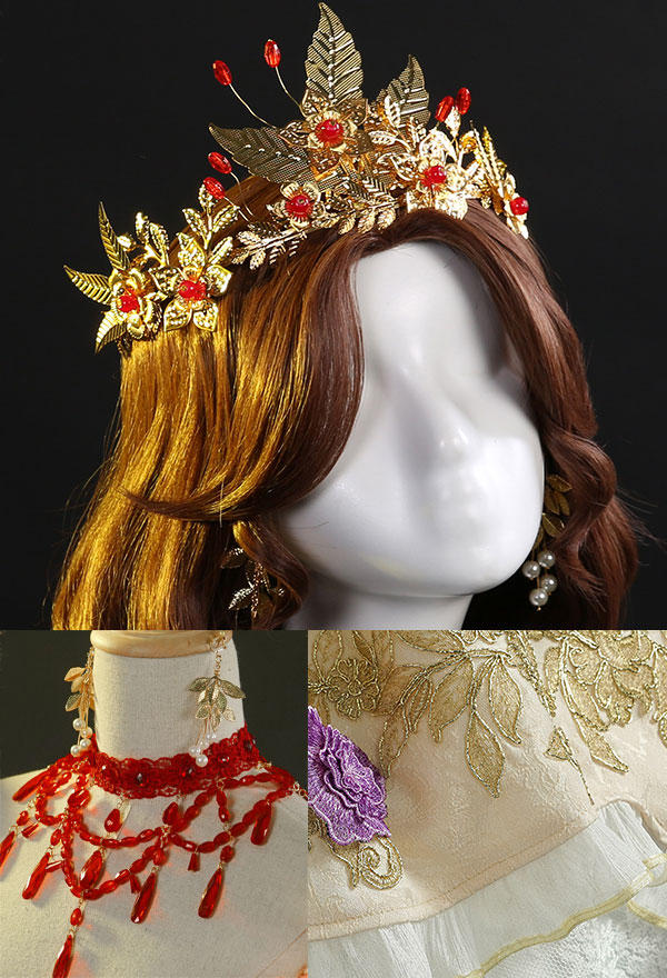 The costume includes dress, petticoat, headdress, pants, shoulder accessory*4, ring, glove*2, invisible bra straps, nacelace, earrings, ribbon, stockings. It is made of lace fabric.