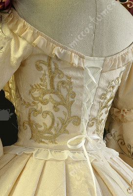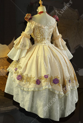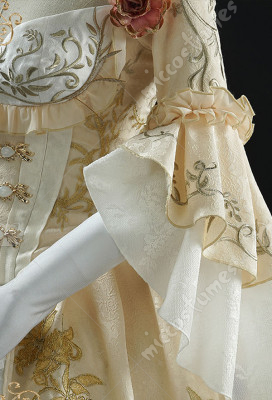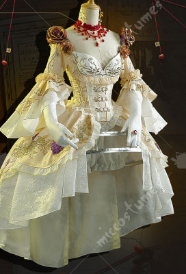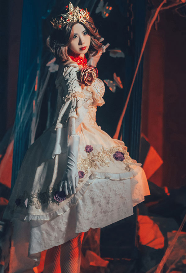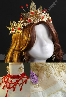 The costume includes dress, petticoat, headdress, pants, shoulder accessory*4, ring, glove*2, invisible bra straps, nacelace, earrings, ribbon, stockings. It is made of lace fabric.
