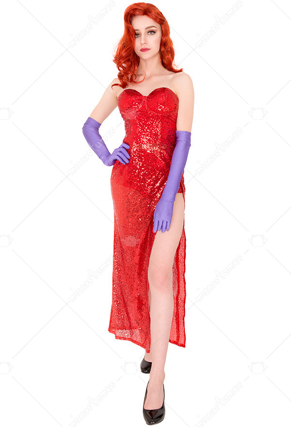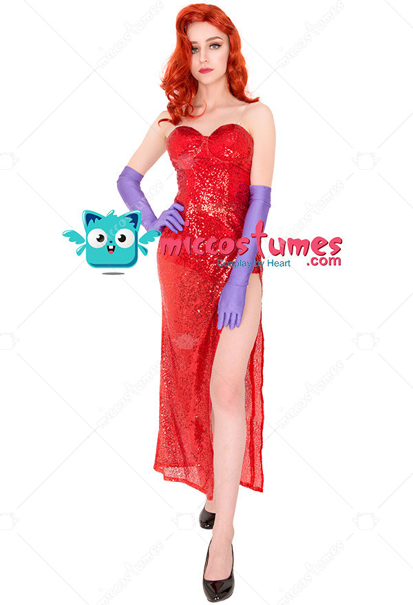 This costume includes dress, gloves, invisible shoulder straps, mini shorts. Our designers redesign this Jessica Rabbit Red Dress with new materials, high-quality gauze fabric covered in sequins which twinkled as you moved, it is more in line with the original version.