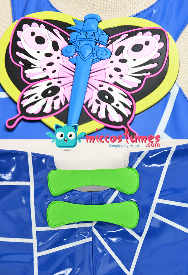 - Design details: All the top and skirt are made of elastic bright leather, which ensures the brightness and fits the body very well. The pattern is designed after checking many angles of the anime character. By using special printed craft, these patterns are more three-dimensional. The highlight is the butterfly on the chest, which was drawn by the designers and molded to a new plastic model. It's shinning and with good shape. The top is sewed with bottom, which ensures the top steady when moving your body.
