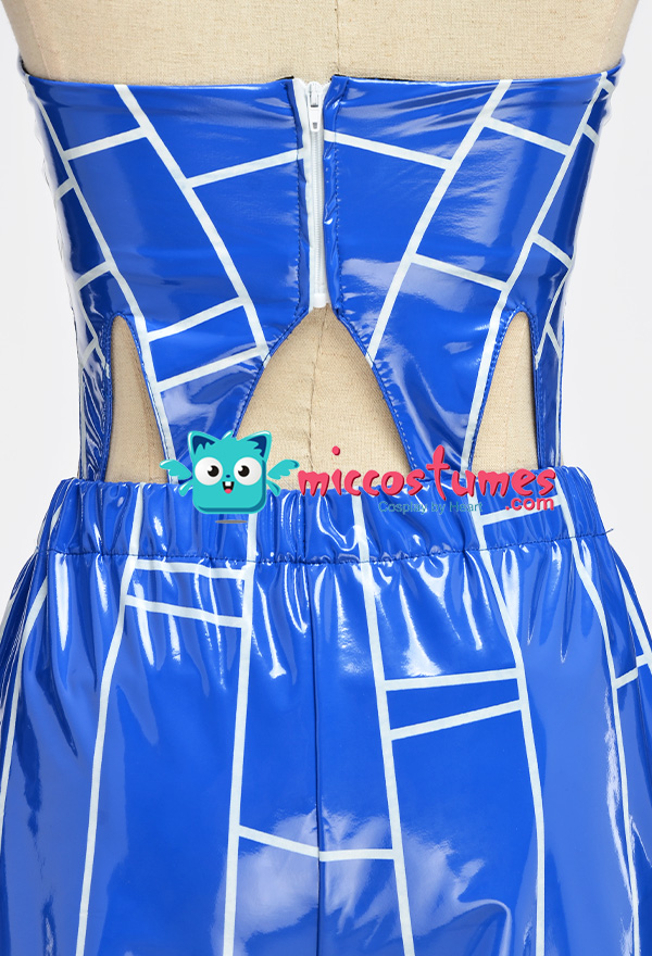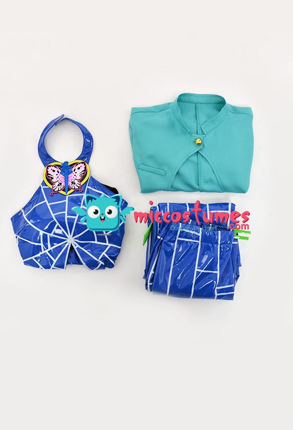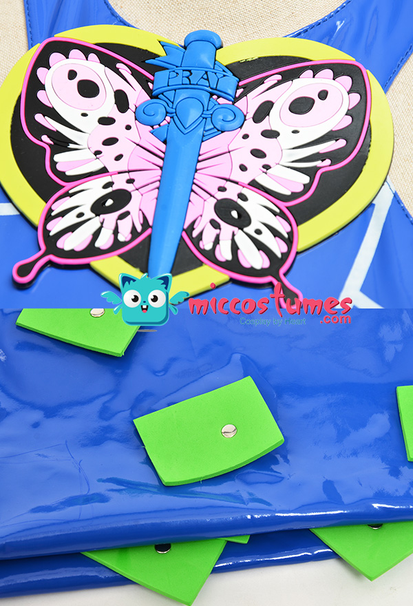 - Design details: All the top and skirt are made of elastic bright leather, which ensures the brightness and fits the body very well. The pattern is designed after checking many angles of the anime character. By using special printed craft, these patterns are more three-dimensional. The highlight is the butterfly on the chest, which was drawn by the designers and molded to a new plastic model. It's shinning and with good shape. The top is sewed with bottom, which ensures the top steady when moving your body.