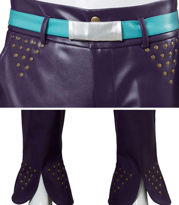 The costume includes top, pants and belt. It is made of ribbed wide strip and garment leather.