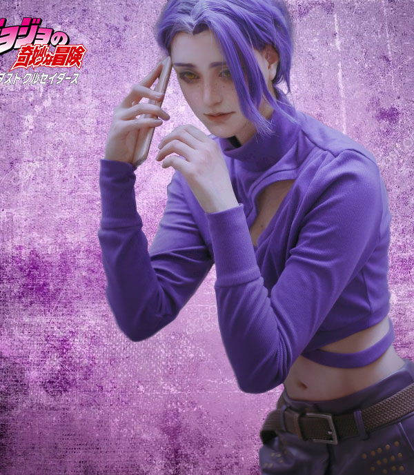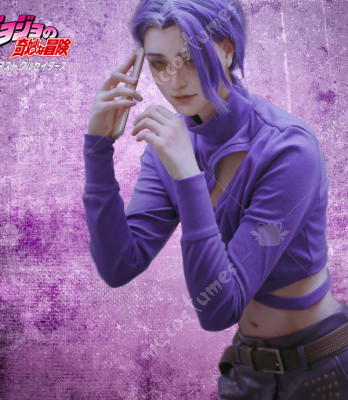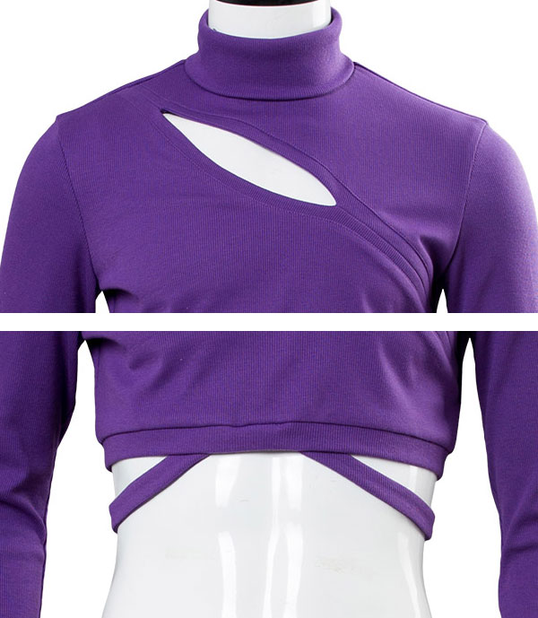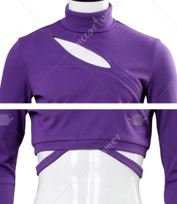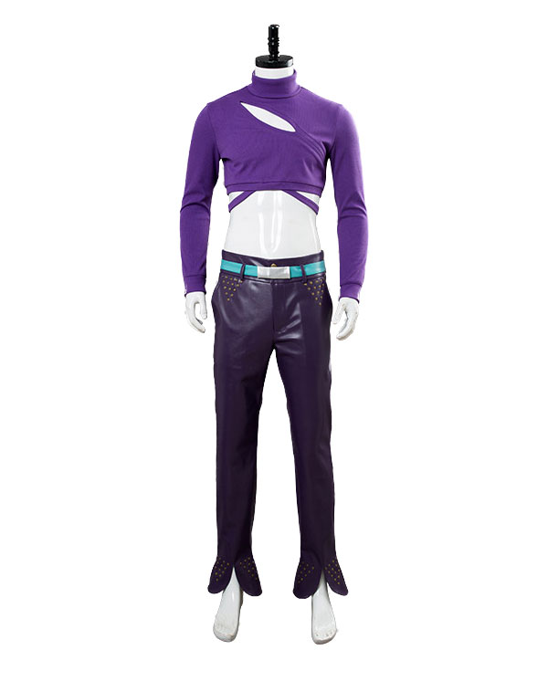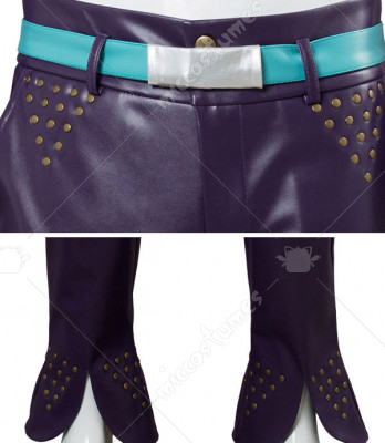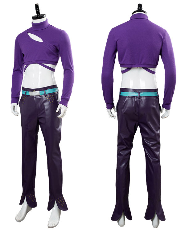 The costume includes top, pants and belt. It is made of ribbed wide strip and garment leather.
