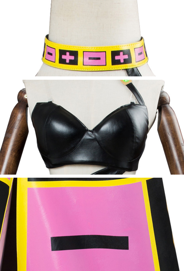 The costume includes top, choker, belt, skirt. It is made of PU leather.