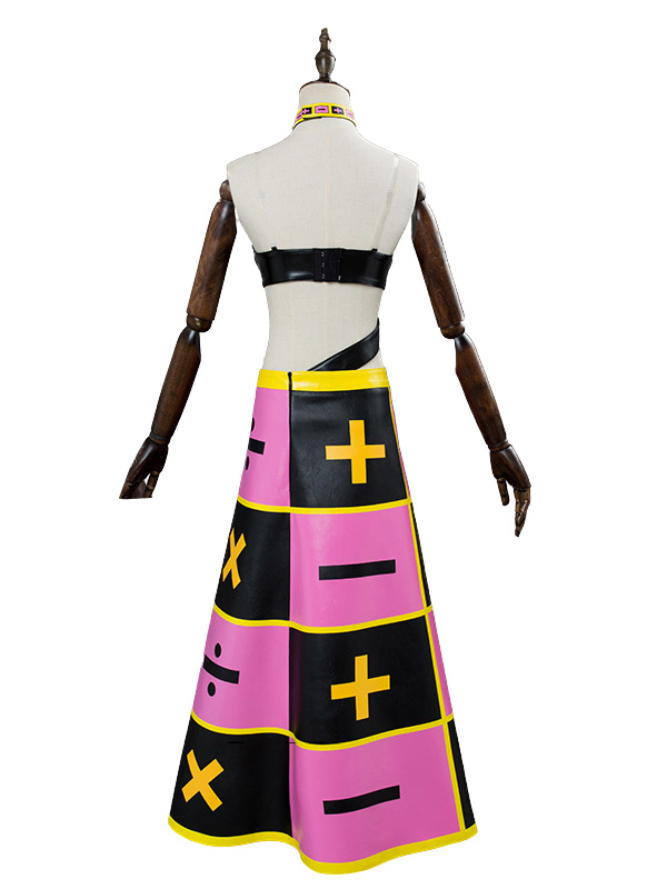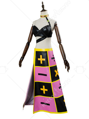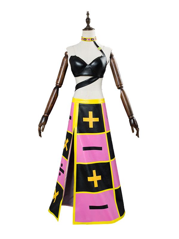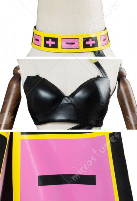 The costume includes top, choker, belt, skirt. It is made of PU leather.