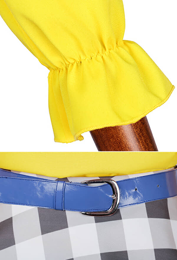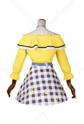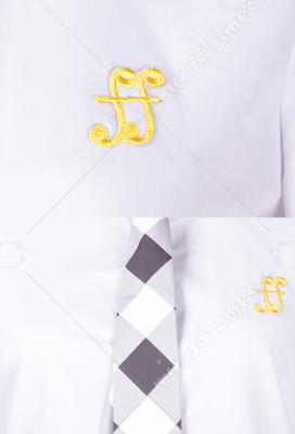 The costume includes bowknot*2, bow tie, top, skirt, belt, sock*2. It is made of uniform cloth, satin and spandex.