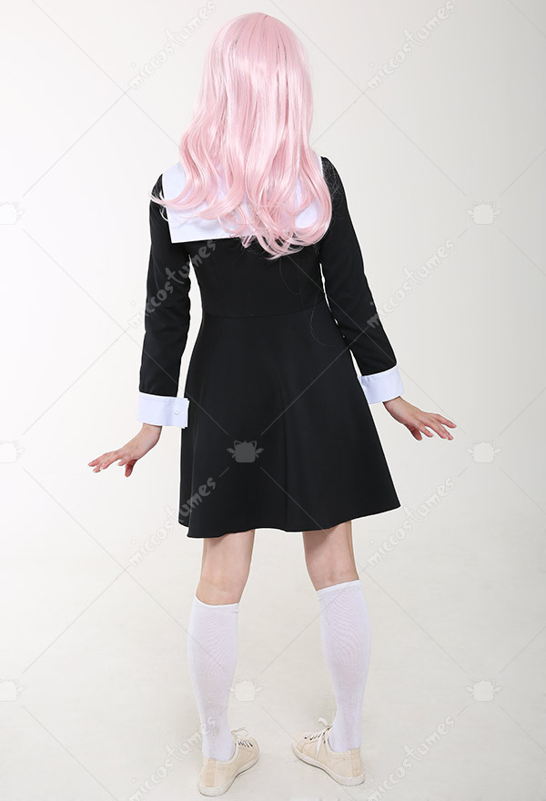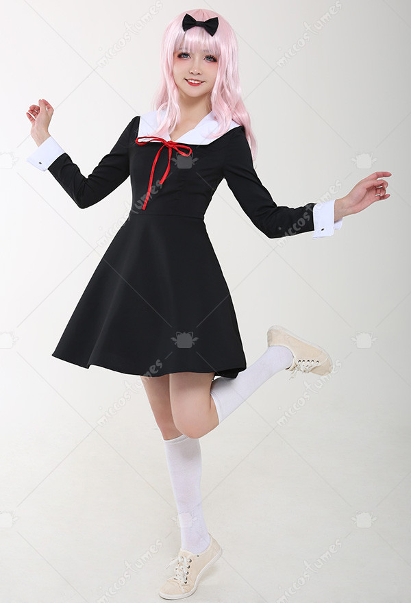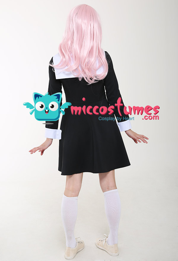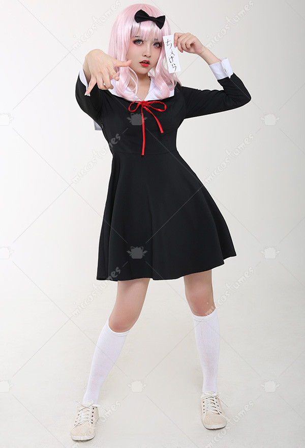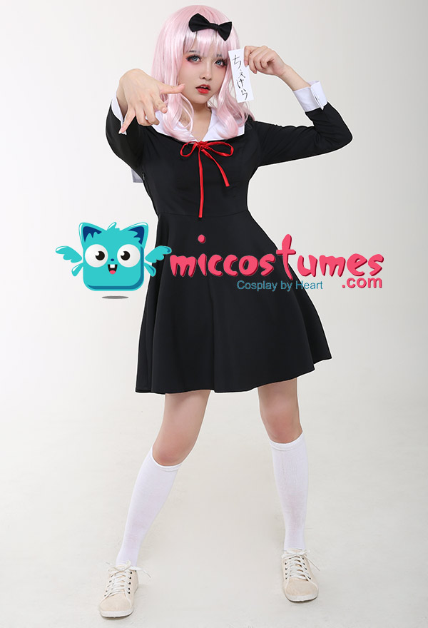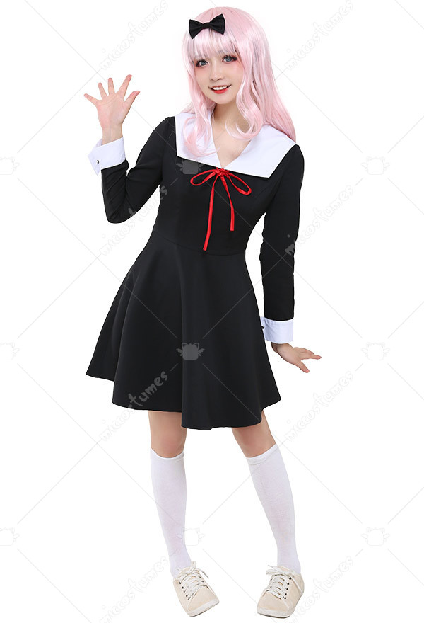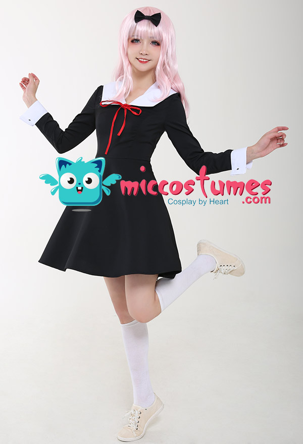 The costumes includes dress, choker, headwear, stockings. It is made of satin, shirt fabric. Notice: Buy the full set and accessories of character Shinomiya Kaguya, please click here. The costume for only one role will be removed soon, and we recommend you to order the new one includes headdress and stockings of Chika and Kaguya. Purchasing one costume, you will have a chance to cosplay two characters.