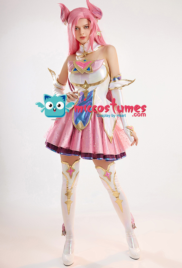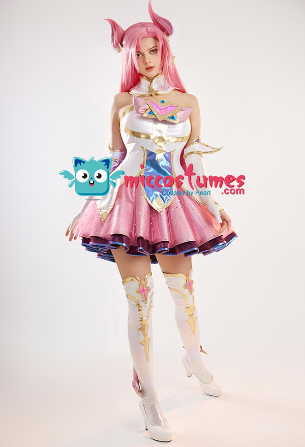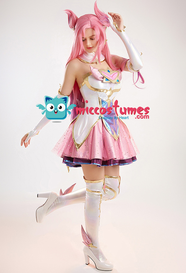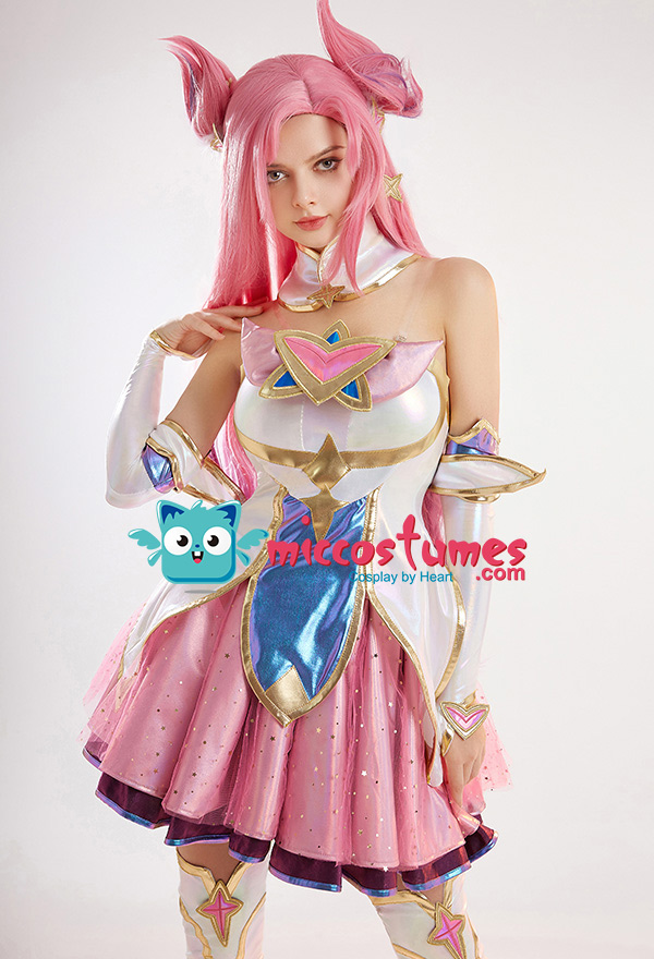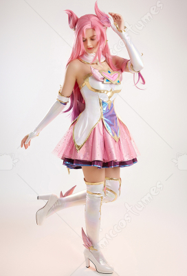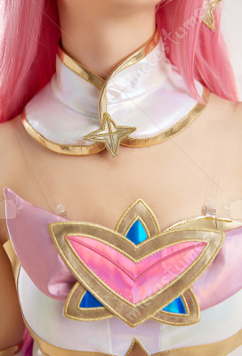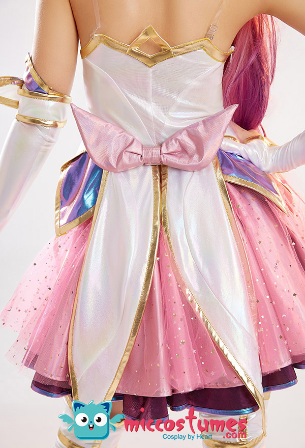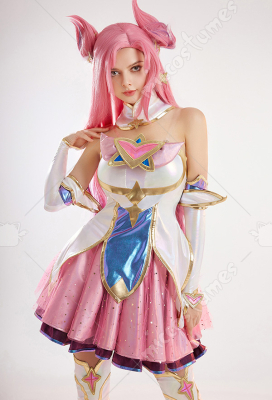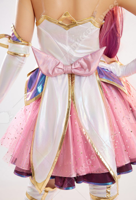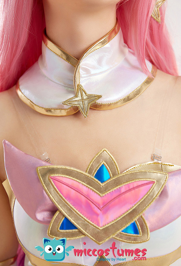 Design Detail: Reasonable fabric selection and perfect shiny dress. Glitter yarn cover for skirt shows sense of layers and 3-dimension. White feathers on hair are similar to original design in every detail.