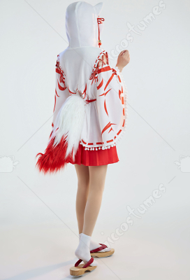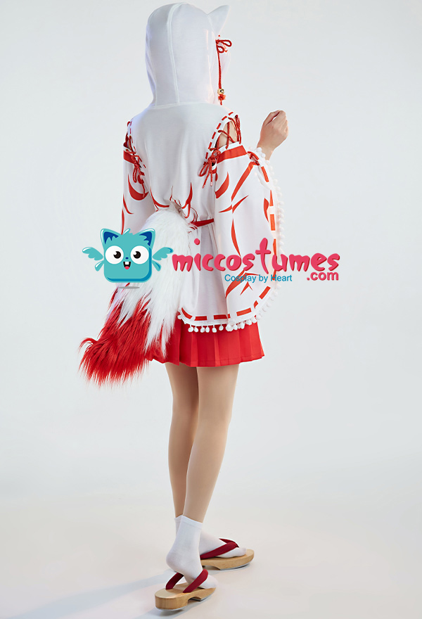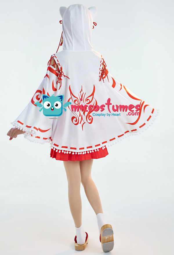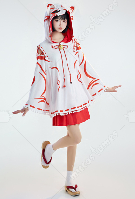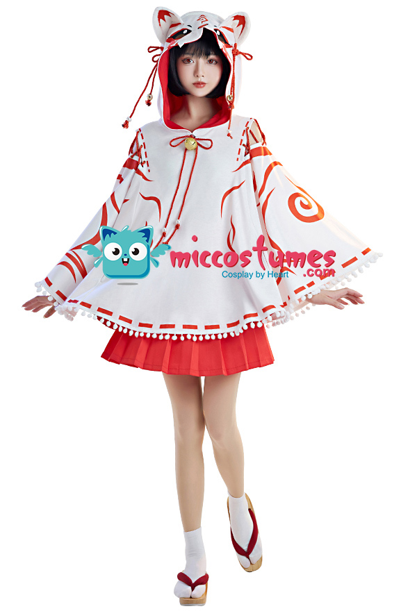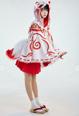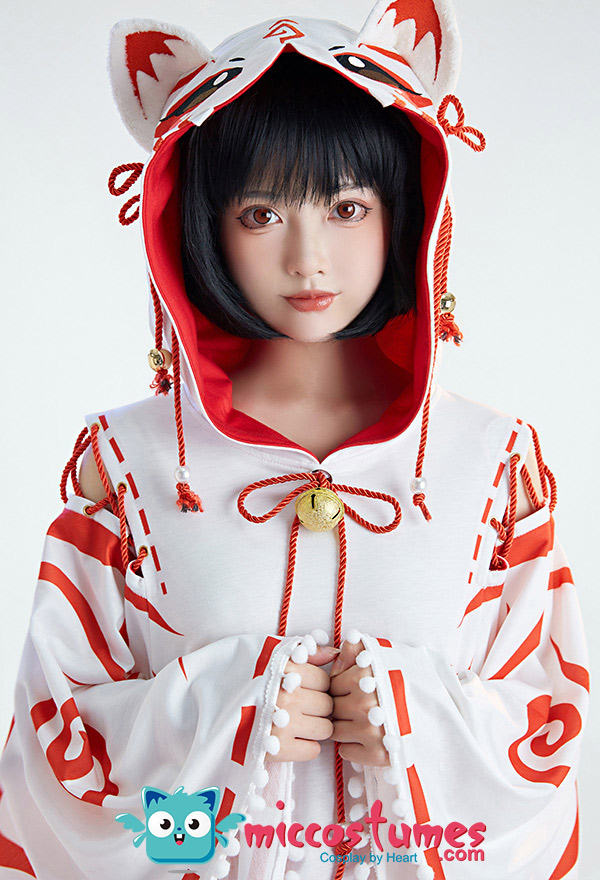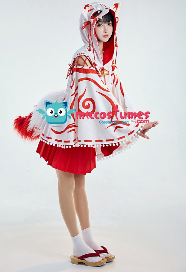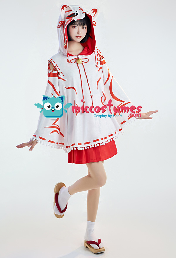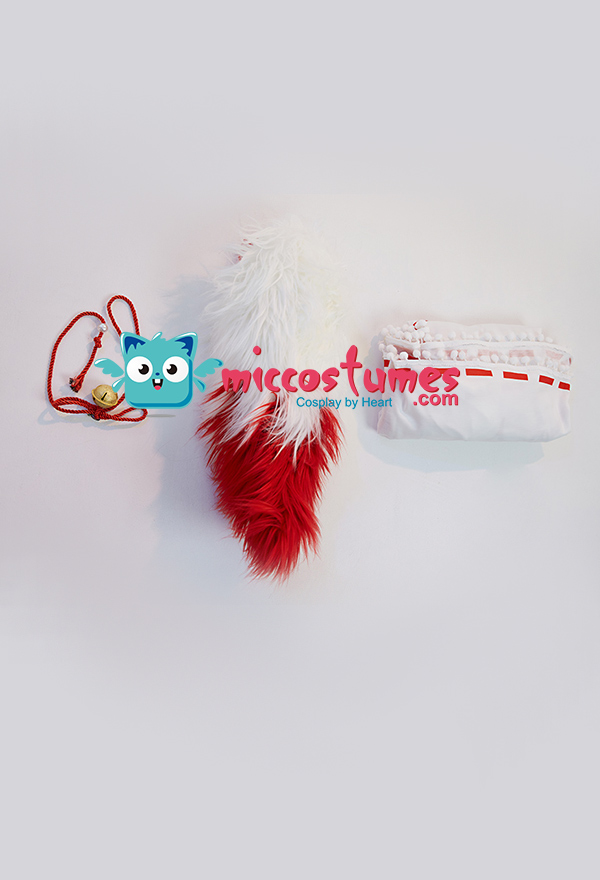 Design details: The cape hat is an embroidered delicate fox face. The shoulders are open and add some straps. White furball tassels trim the hem of the cape. The bell on the chest is also cute. The furry tail penetrated from the back of the cloak and was tied around the waist to be fixed.