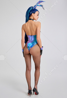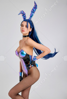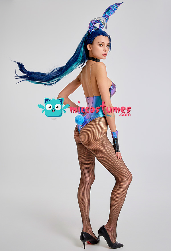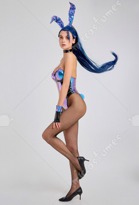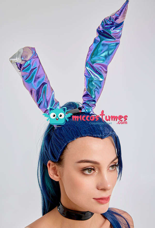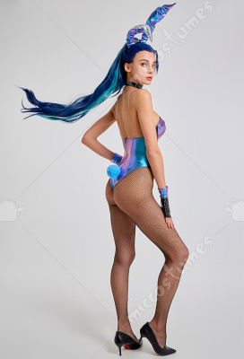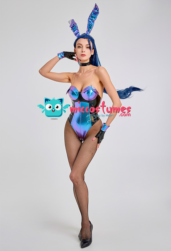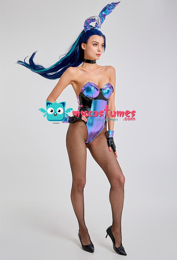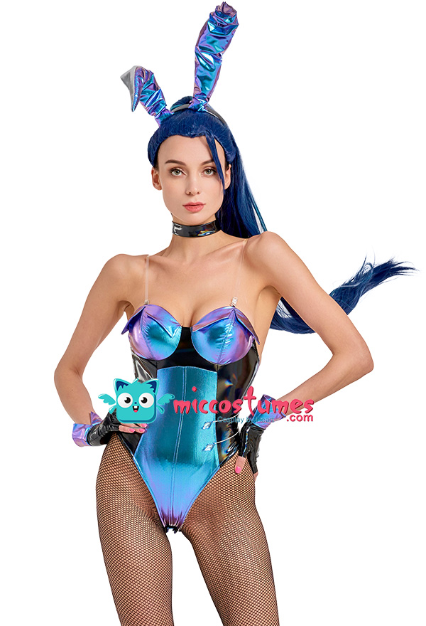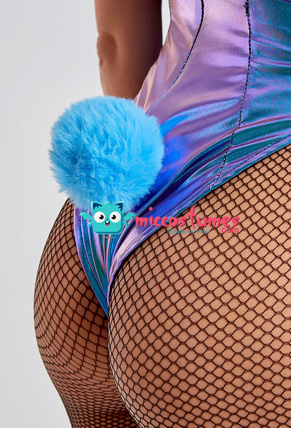 Design Details: This costume is mainly made of colorful stretchy glossy fabric with the leg openings decorated with chains. The crotch is openable and a hidden zipper is provided on the back. The bunny ears are provided with aluminum wires. The tail, pantyhose, neck accessory, gloves are also provided.