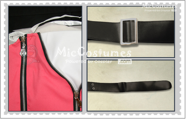 2.Zippers: three zippers are sewn onto the dress. Two pairs on the side have the same length with the dress. The middle one ends 7cm above the hem. All of them are functional in helping you more easily put on and off the costume. Besides, they are made to be faithful to the anime. Exquisite slider pulls in cool silver black look great!