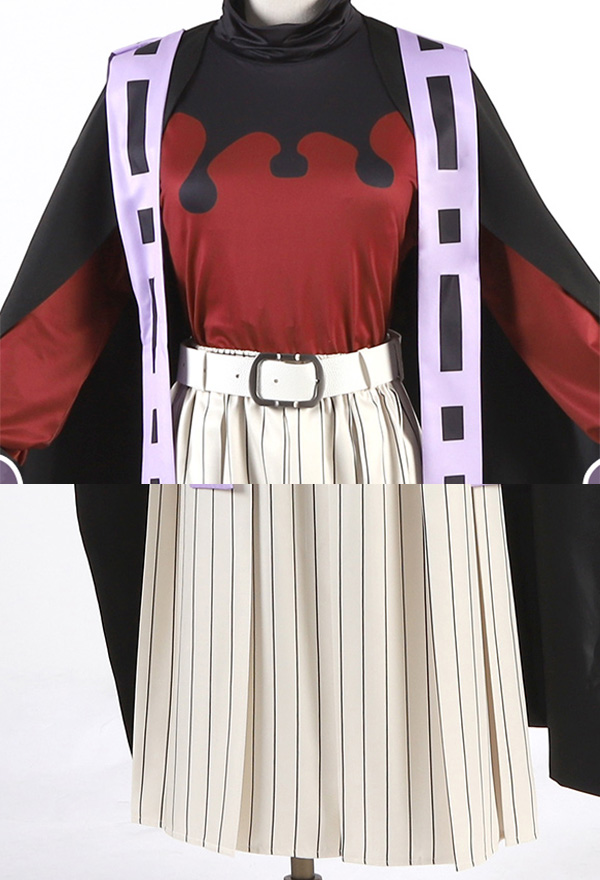 The costume includes top, cloak, pants, hat, head accessory, glove, belt. It is made of polyester.
