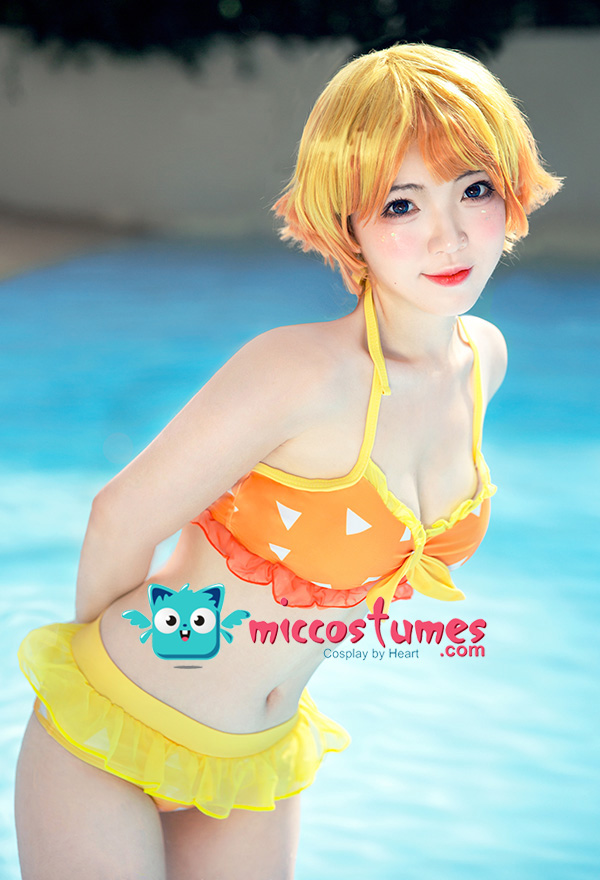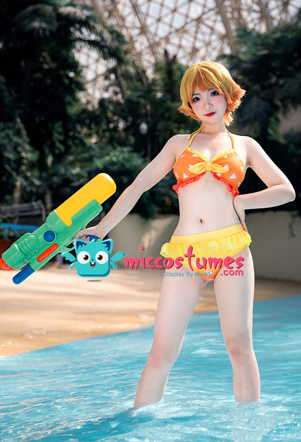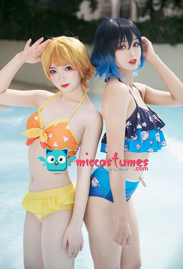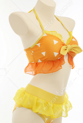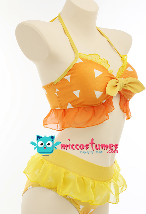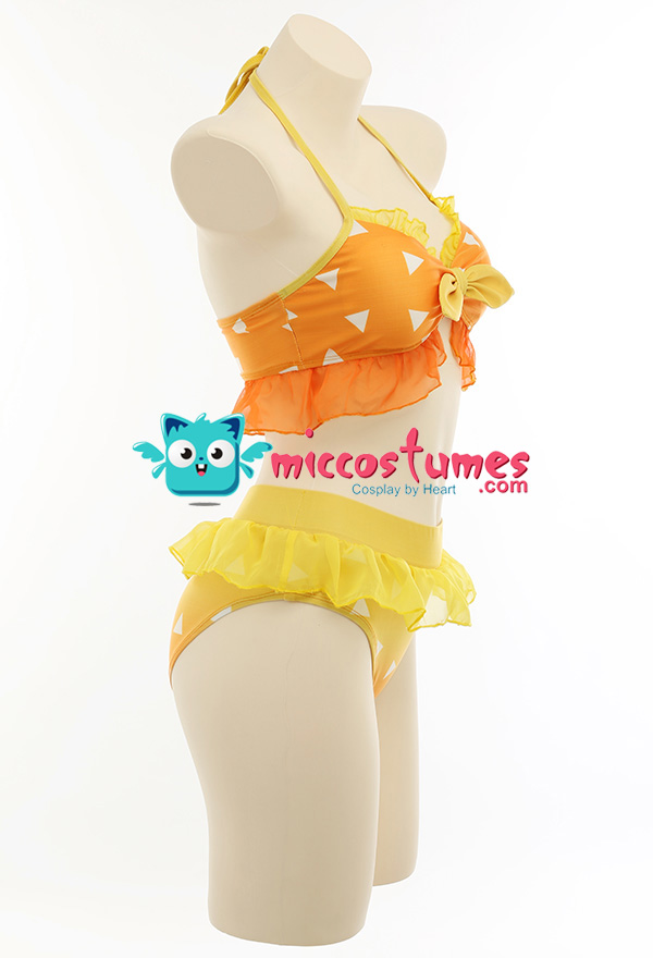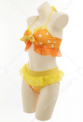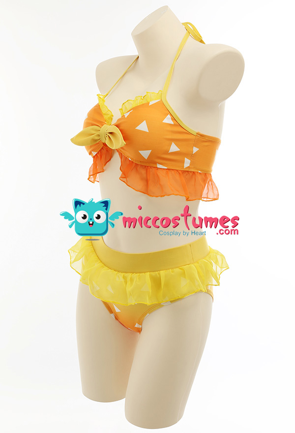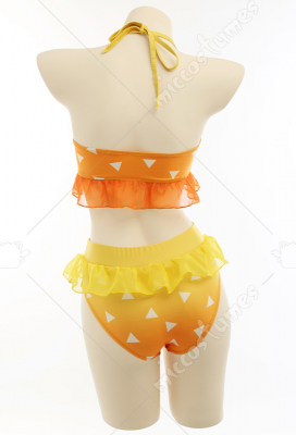 Cosume Includes: top, shorts. Material: chiffon. Design Details: The chiffon ruffles endow the whole outfit with agility and cuteness. The triangle pattern restores Agatsuma Zenitsu’s outfit in the anime, and with the decoration of a bow, it looks very cute. The halter design provides convenience for adjustment. Attention: The swimming suits belong to underwear, so please wear shorts when you try on, otherwise the swimming suits can’t be returned or exchanged if the question appears. All the swimming suits are with Protective Hygienic/Hygienic Panty Swimwear Liner, and the swimming suits can’t be returned or exchanged if ripped the liner. Wash Care Instructions: Not machine washable Do not iron Do not bleach Hang to dry No dry cleaning No dryer Washing precautions: 1.The swimsuit can only be washed in warm water, not soaked and washed in high temperature water. 2. Do not use detergent, soap, disinfectant, or other chemical cleaners to wash swimsuits. 3. There may be chemicals or seawater in the pool which could cause the swimsuit to fade or deform. Please wash your swimsuit immediately after use and dry it in a cool place. Please do not expose the swimsuit to the sun to dry. 4. When the swimsuit is wet, it is very easy to dye it with other clothes. Please wash different color swimsuits separately. Advice: 1. Please keep away from objects with rough surfaces such as stones. 2. Chemical agents and sunscreen products reduce the elasticity of swimsuits. Please apply sunscreen after putting on your swimsuit. Please take a shower after exercise before wearing a swimsuit. 3. Please do not put your swimsuit in a closed bag or in the trunk of a car. High temperatures can easily discolor swimsuits. Please wash the swimsuit with clean water as soon as possible after using the swimsuit.