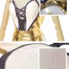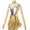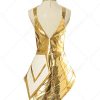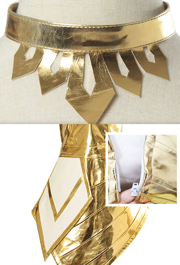 The costume includes dress, armband*2, leg band, necklace and bracelet(separately selled). It is made of lacquered gold leather, starlight sequins and elastic mesh.