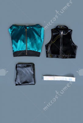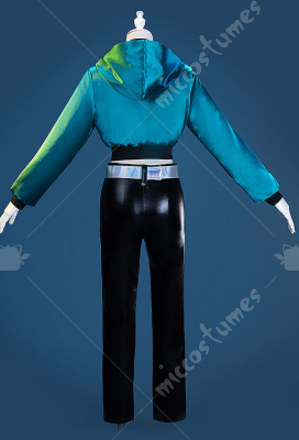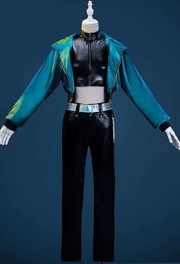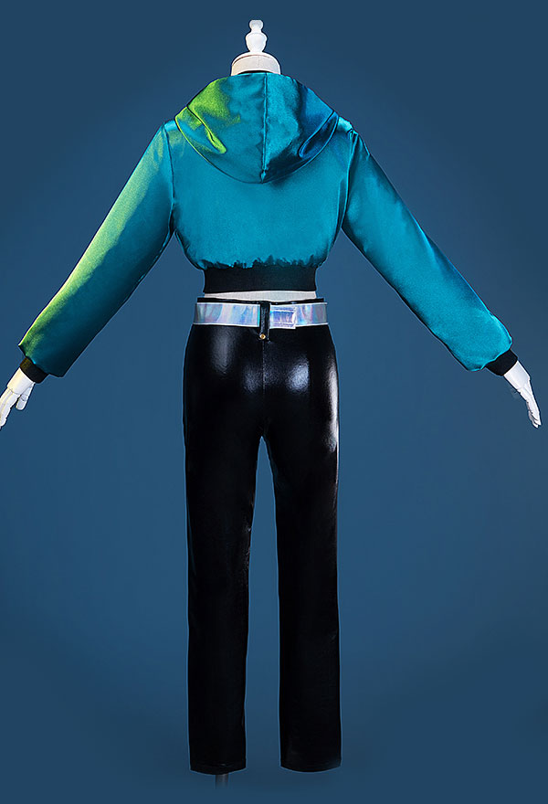 Costume Includes: green jacket, black top, pants, belt Material: shiny fabric Design Details: The coat is made of shiny fabric, which has texture.