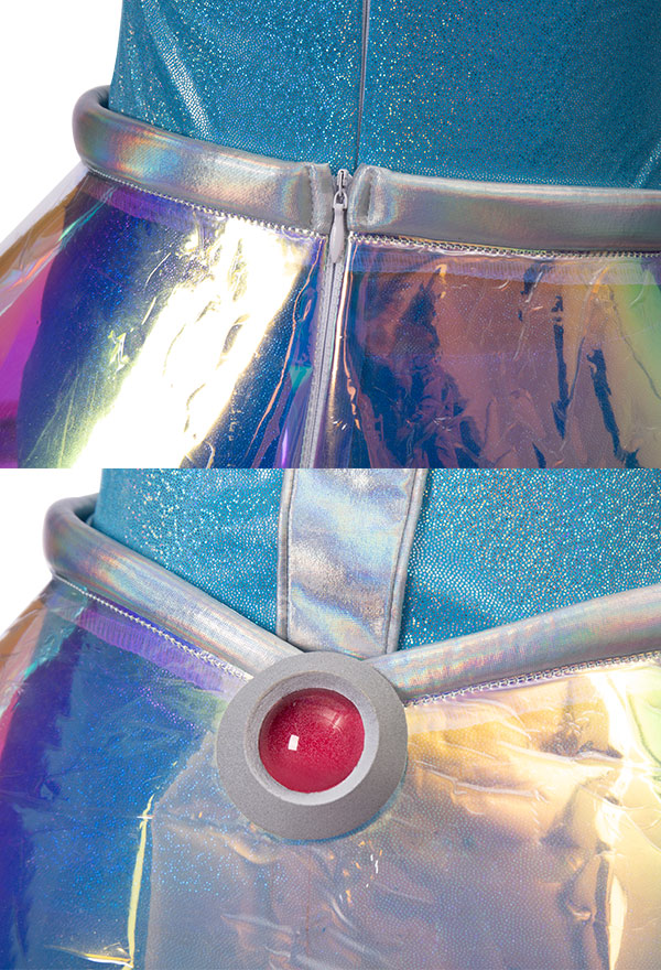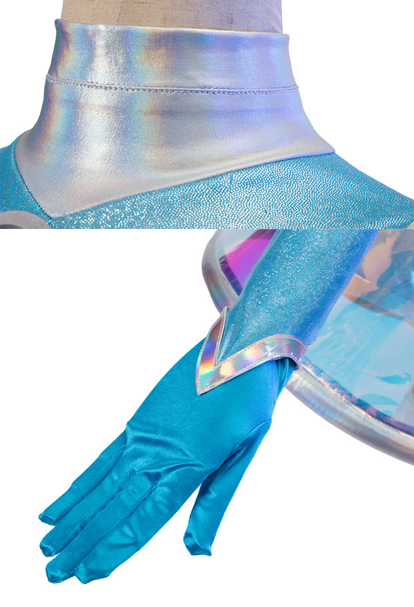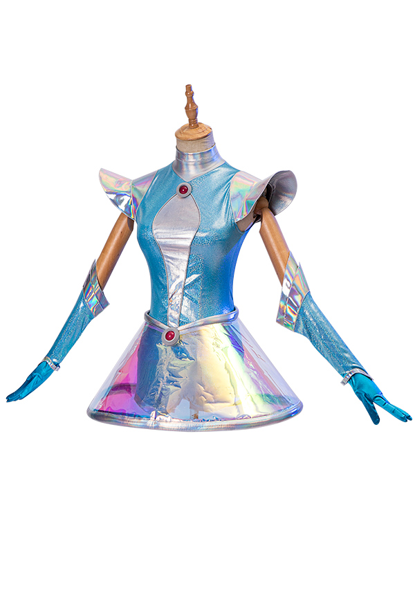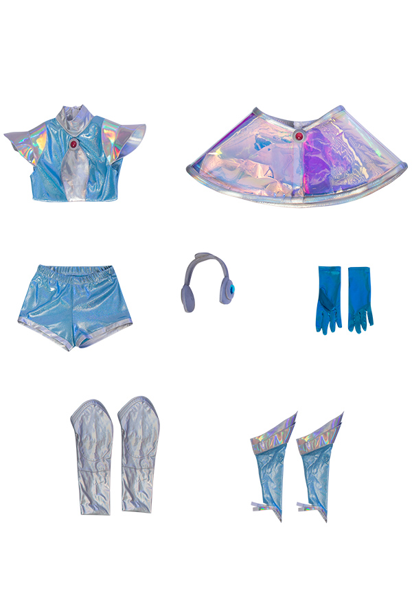 Costume Includes: top, skirt, pants, headset, gloves, wristbands, socks. Material: symphony silver soft leather, milk silk, laser bronzing cloth, pvc, laser hard leather.