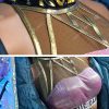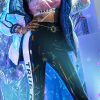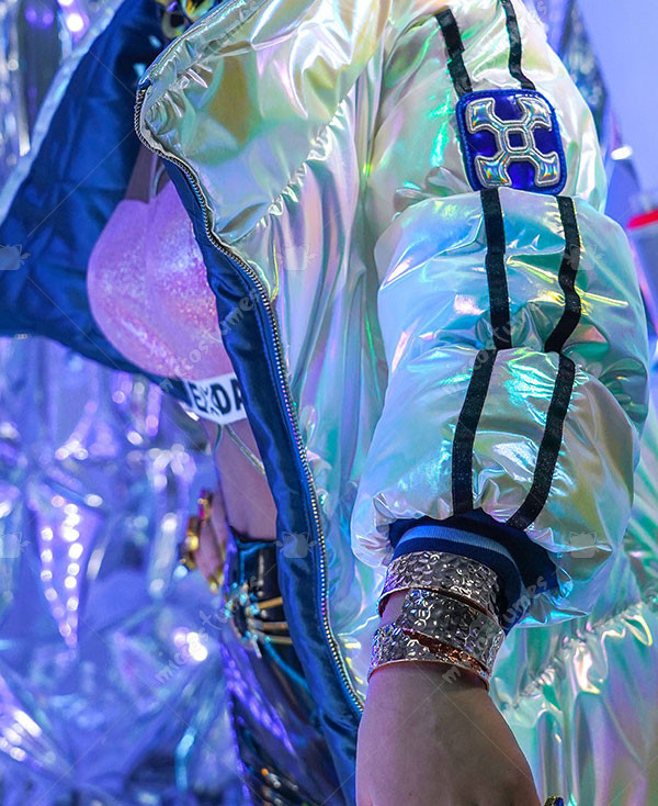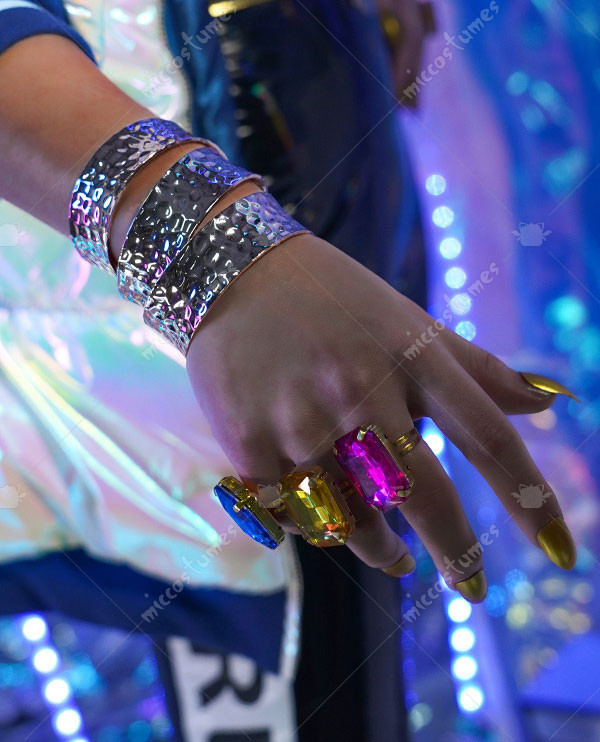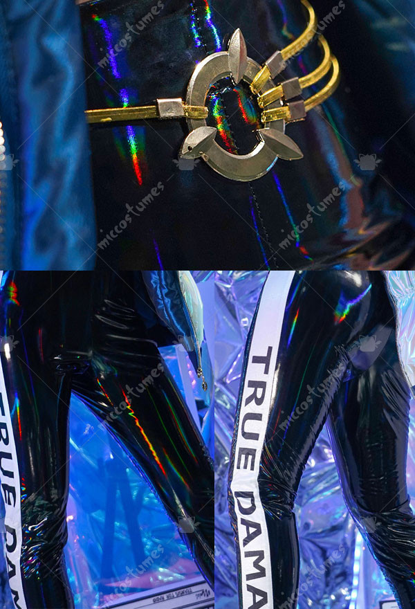The costume includes bra top, coat, bra pad*2, pants, glass, earring*2, rings, nail polish, nail tips, waist accessory, bracelet. It is made of patent leather.