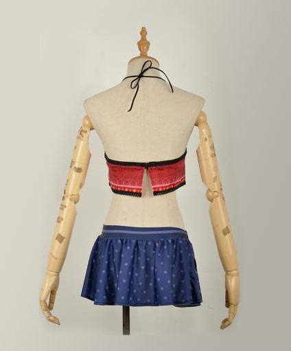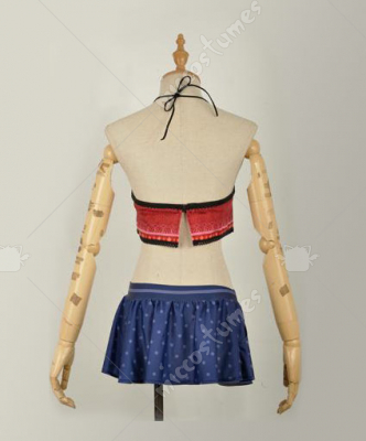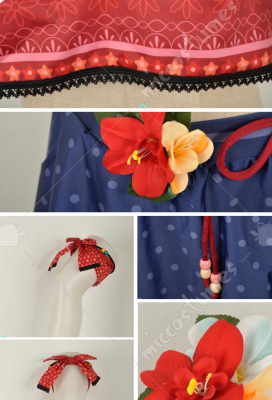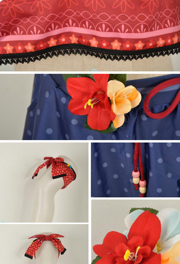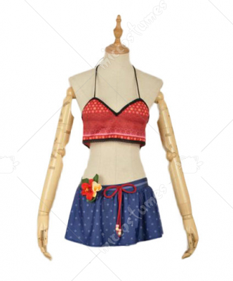 The costume includes bikini top, bikini skirt, leg accessory, headwear. It is made of spandex fiber.