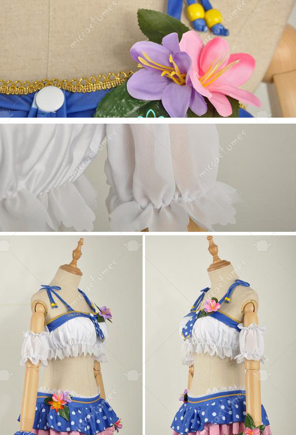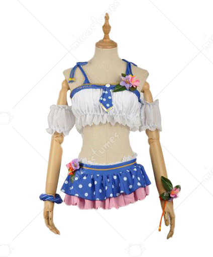The costume includes bikini top, bikini panties, wrist accessory, headwear. It is made of spandex fiber.