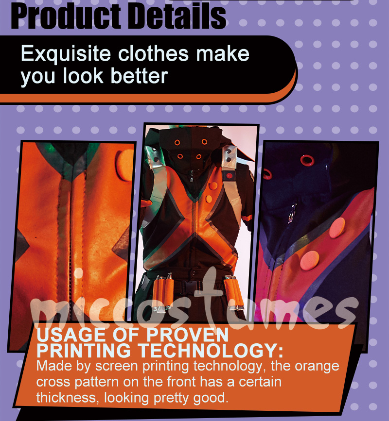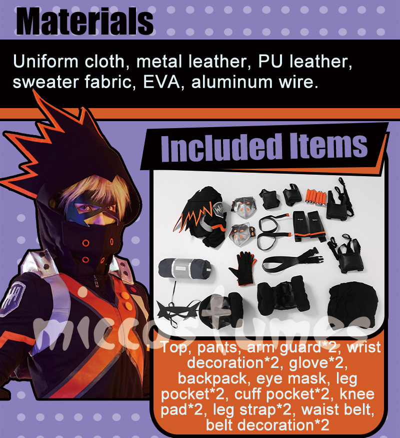 | Included Items | top, pants, bracelets*2, wrist decorations*2, gloves*2, backpack, eye mask, leg pockets*2, caff pockets*2, knee pads*2, leg straps*2, waist belt, belt decorations*2 |