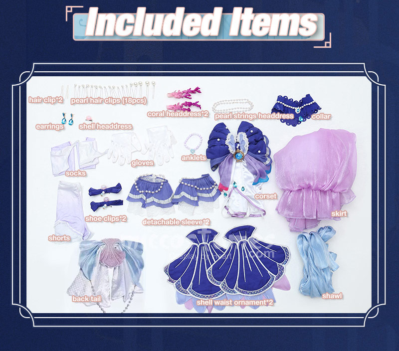 | Included Items | skirt, shell waist ornament*2, corset, detachable sleeve*2, back tail, shorts, socks, gloves, shawl, collar, shoe clips*2, anklets, shell headdress, earrings, pearl hair clips (18pcs), coral headdress*2, pearl strings headdress, hair clip*2 |