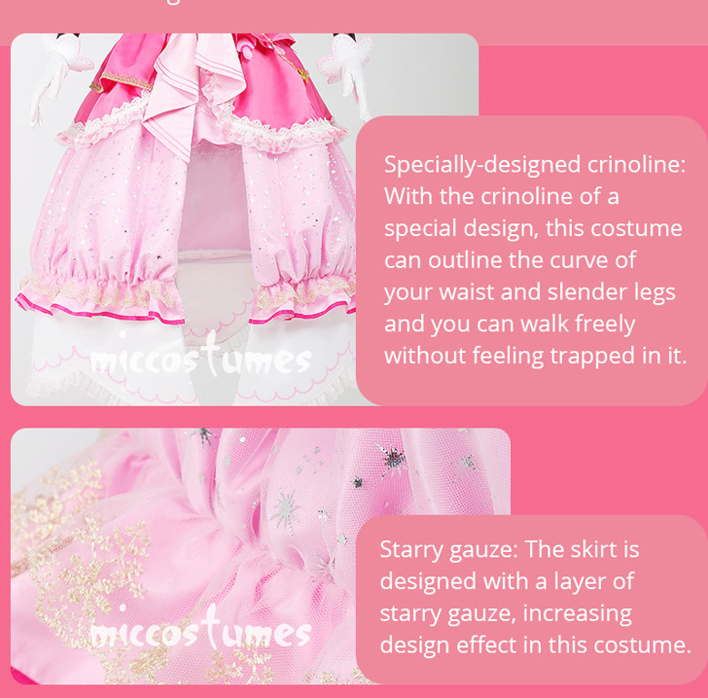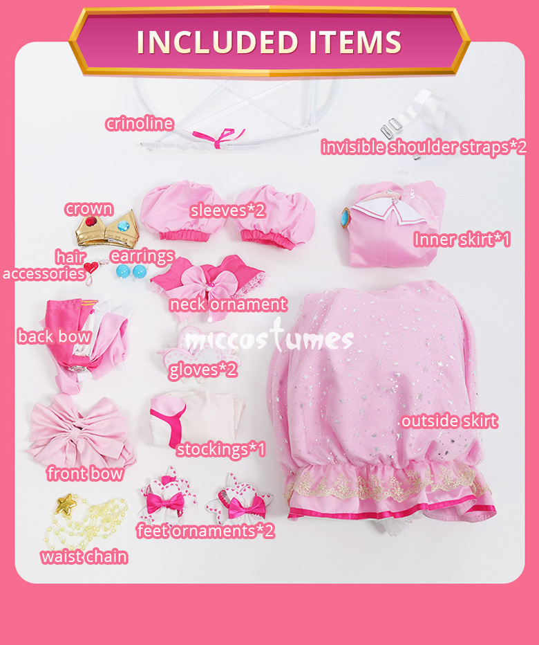 | Included Items | inside skirt *1, outside skirt *1, sleeve *2, front middle bow *1, back bow *1, choker*1, crown *1, headwear *1, gloves *2, pantyhose *1, foot ornament *2, earrings *2, bustle *1, waist chain *1, invisible sash *2 |